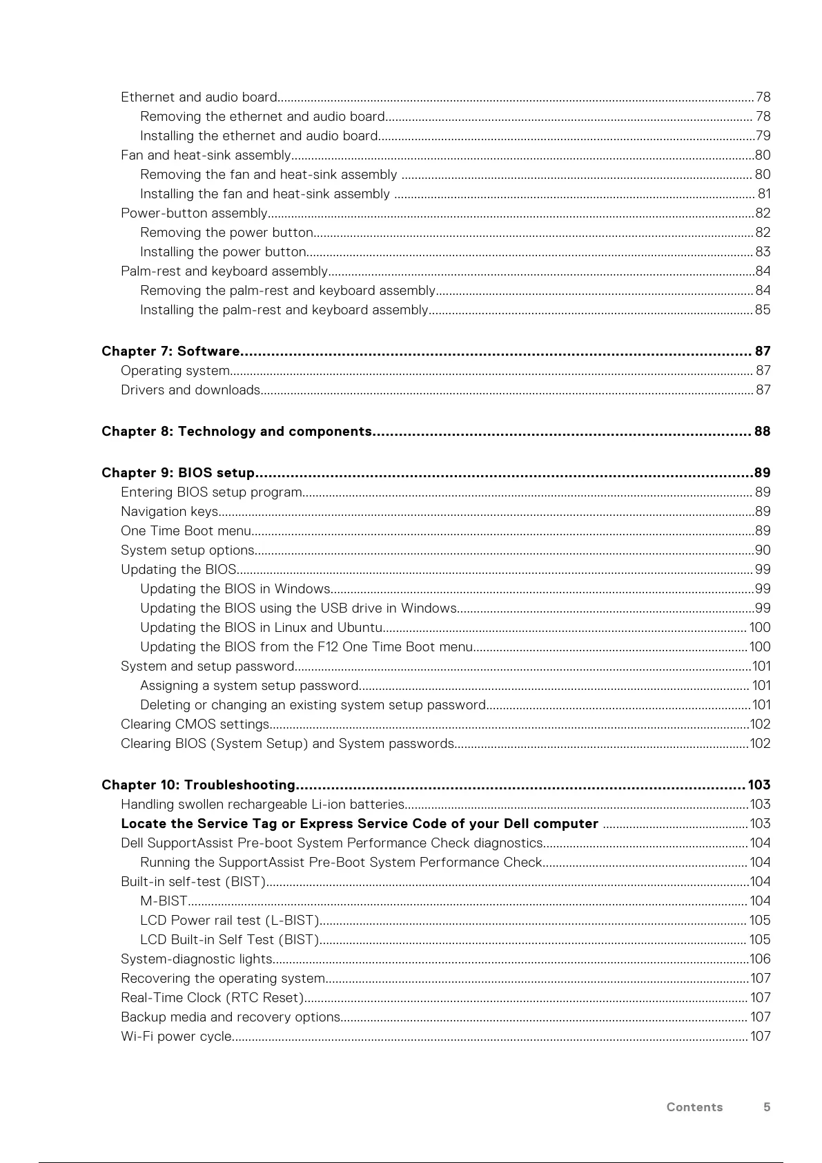 Dell SupportAssist Pre-boot System Performance Check diagnostics.............................................................. 104