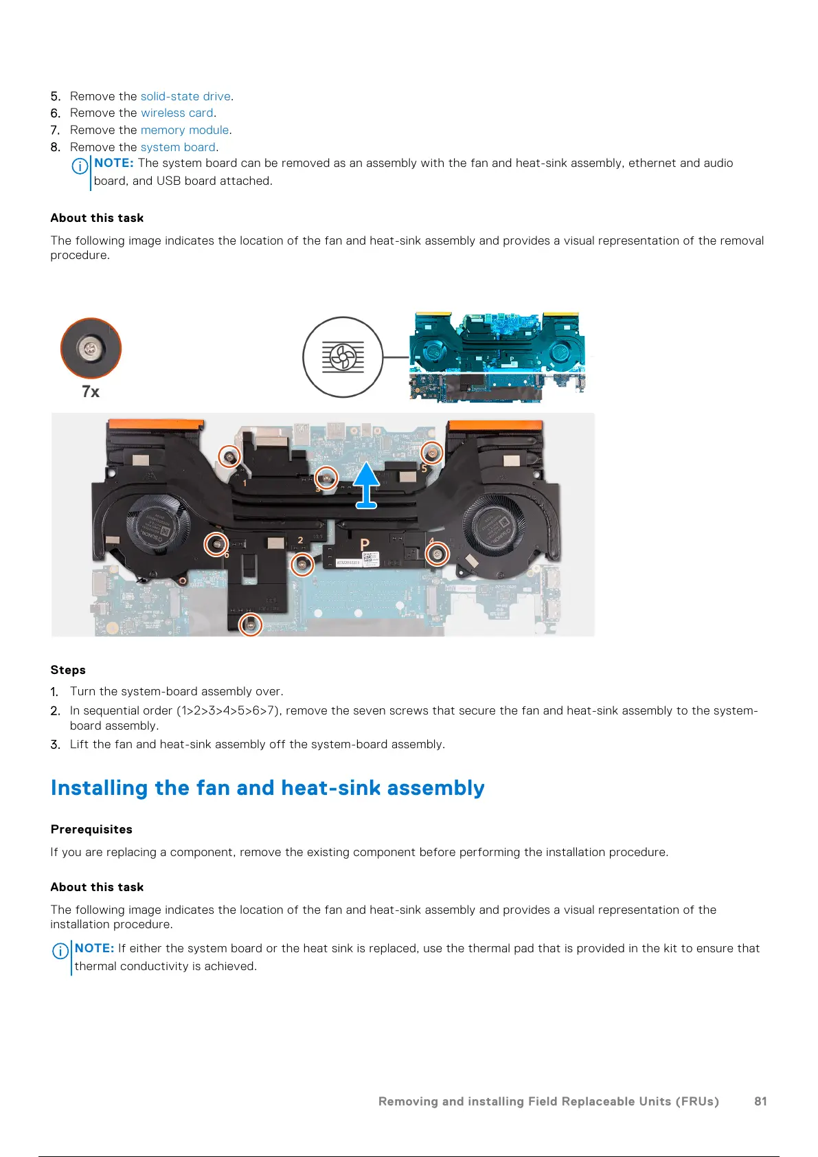 NOTE: The system board can be removed as an assembly with the fan and heat-sink assembly, ethernet and audio