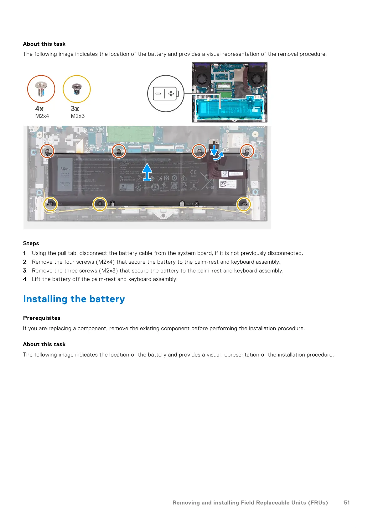 2. Remove the four screws (M2x4) that secure the battery to the palm-rest and keyboard assembly.