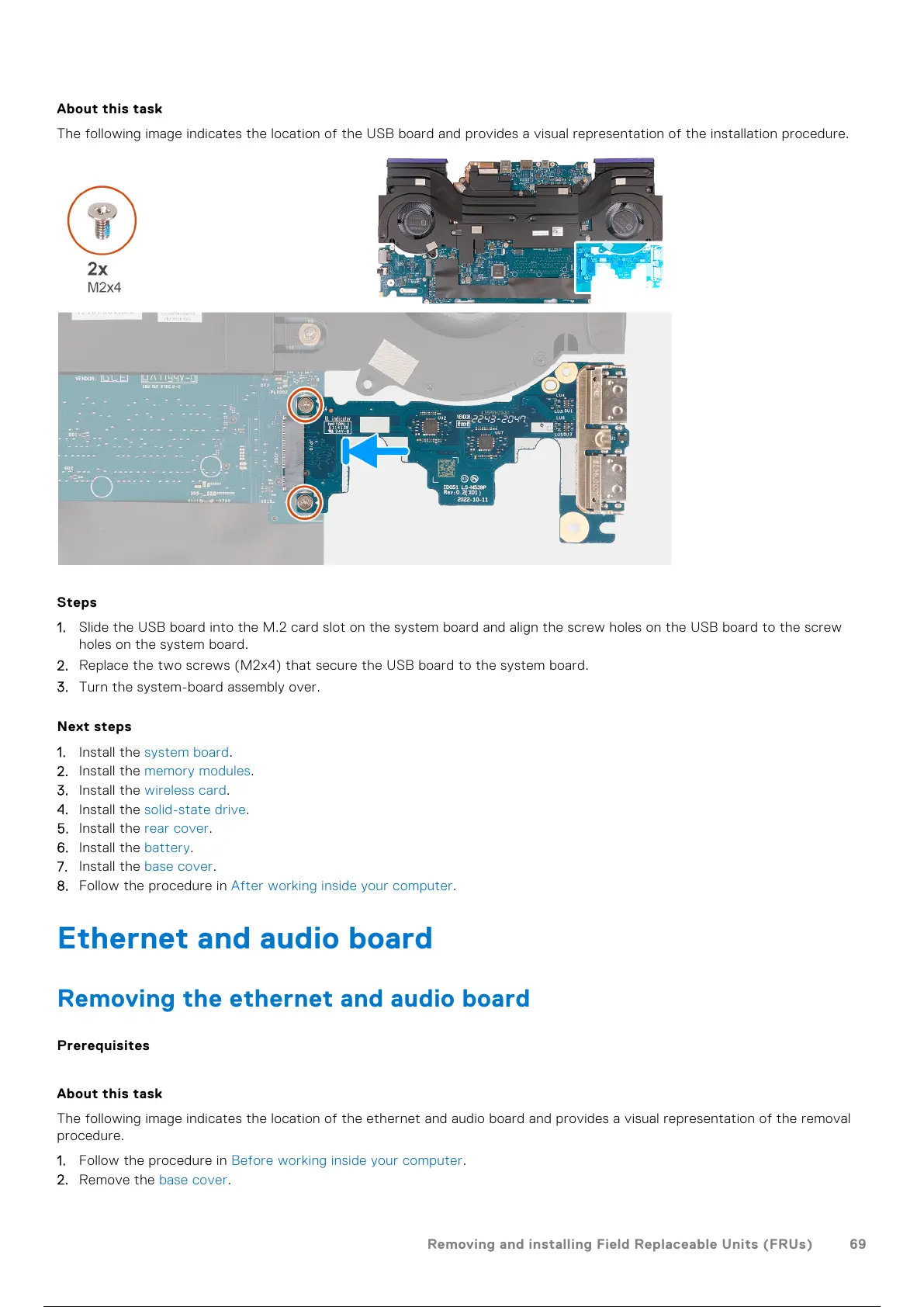 2. Replace the two screws (M2x4) that secure the USB board to the system board.