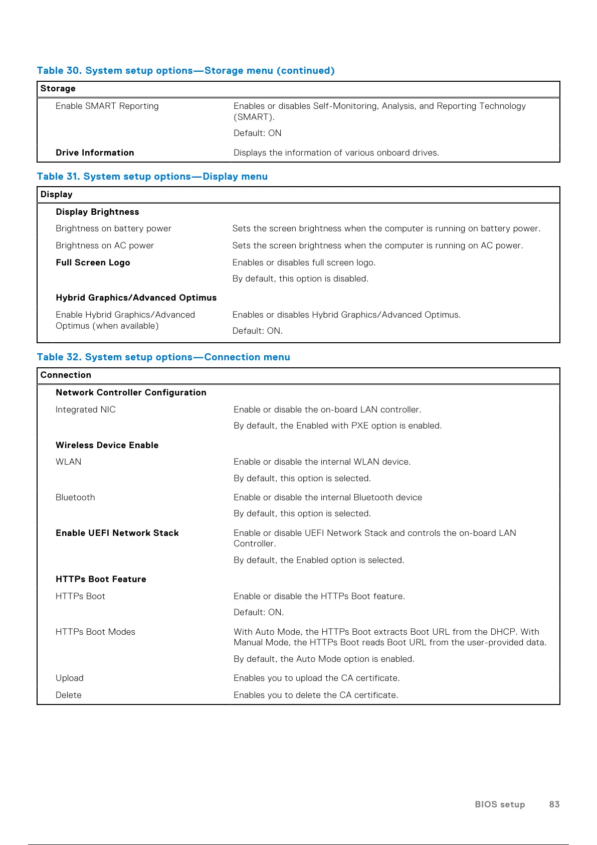 Table 32. System setup options—Connection menu