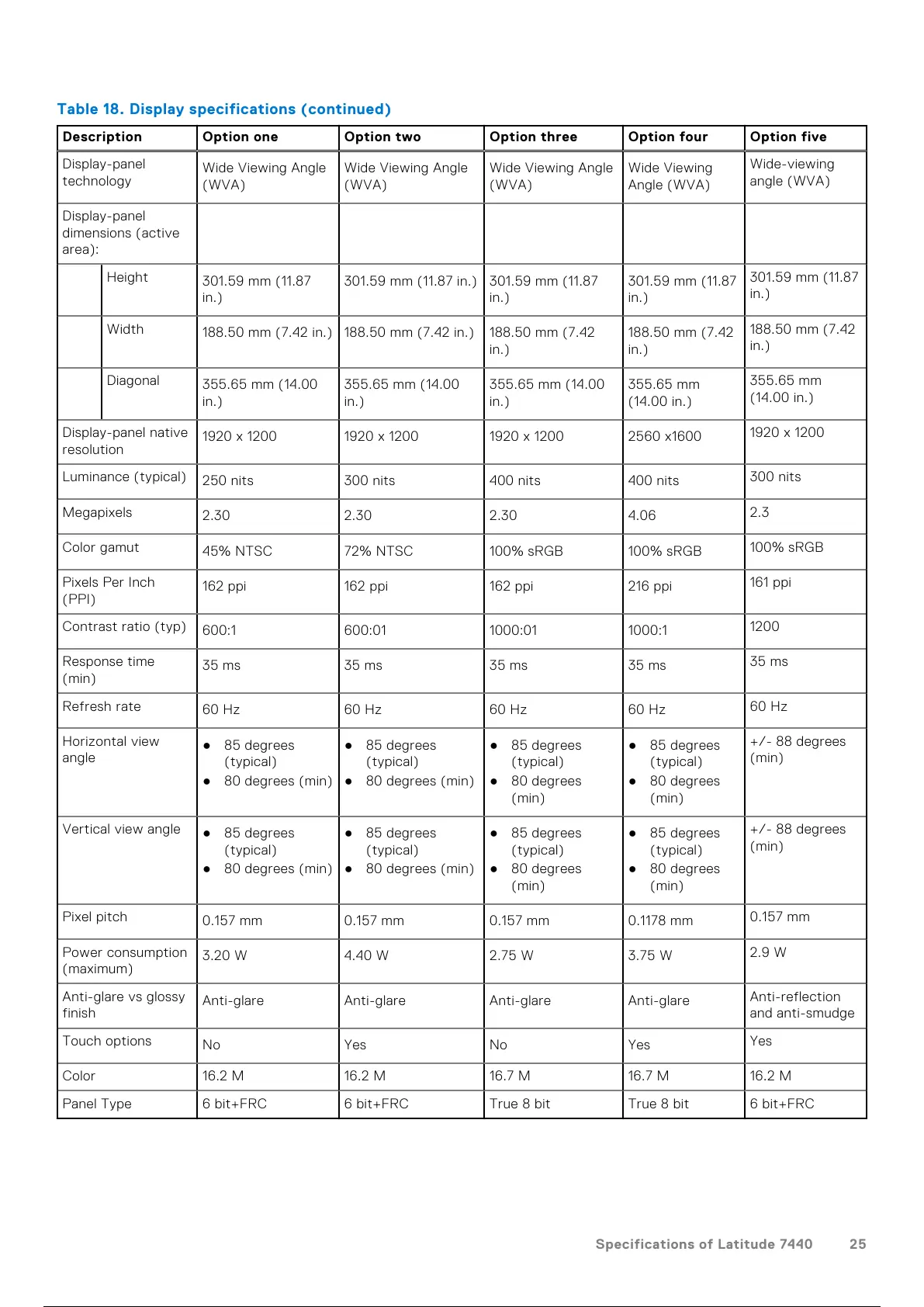 Table 18. Display specificationsī(continued)