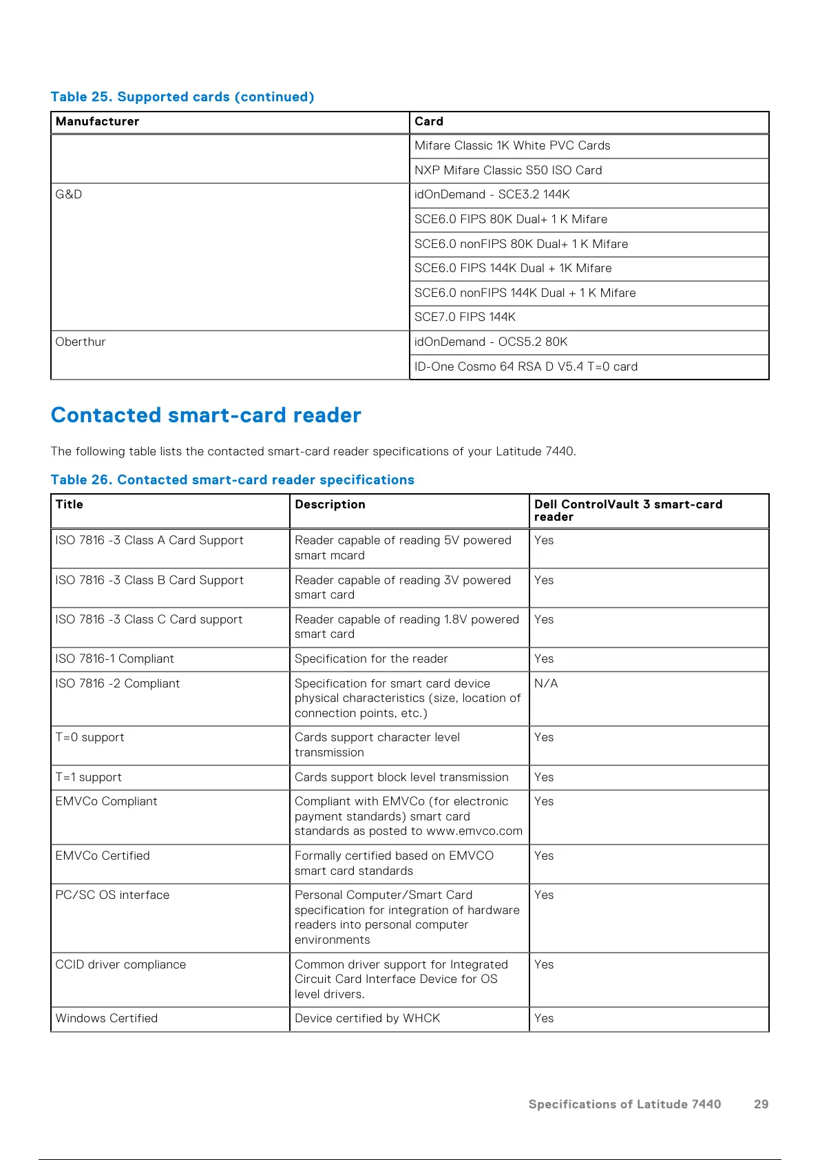 The following table lists the contacted smart-card reader specifications of your Latitude 7440.