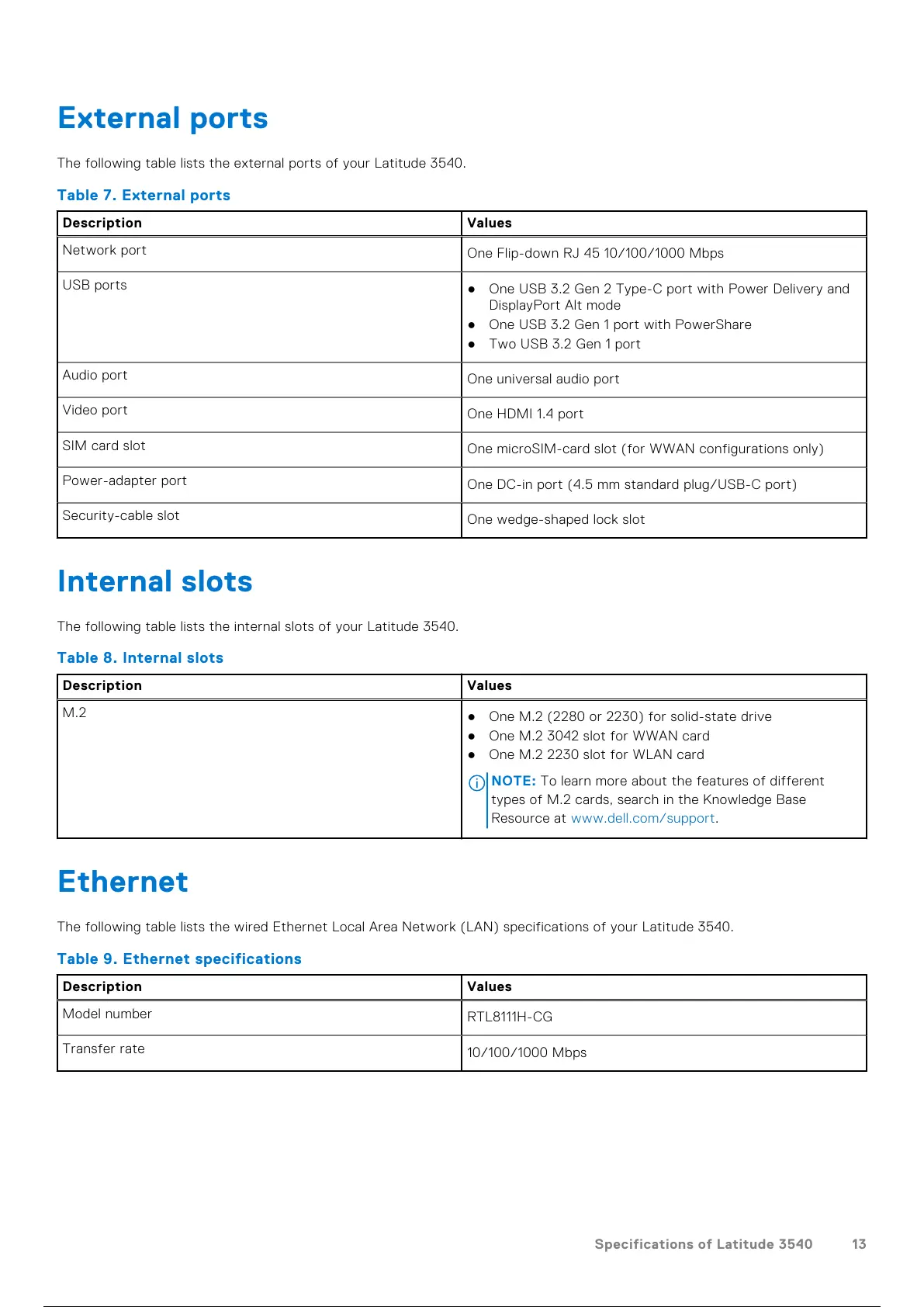 The following table lists the wired Ethernet Local Area Network (LAN) specifications of your Latitude 3540.