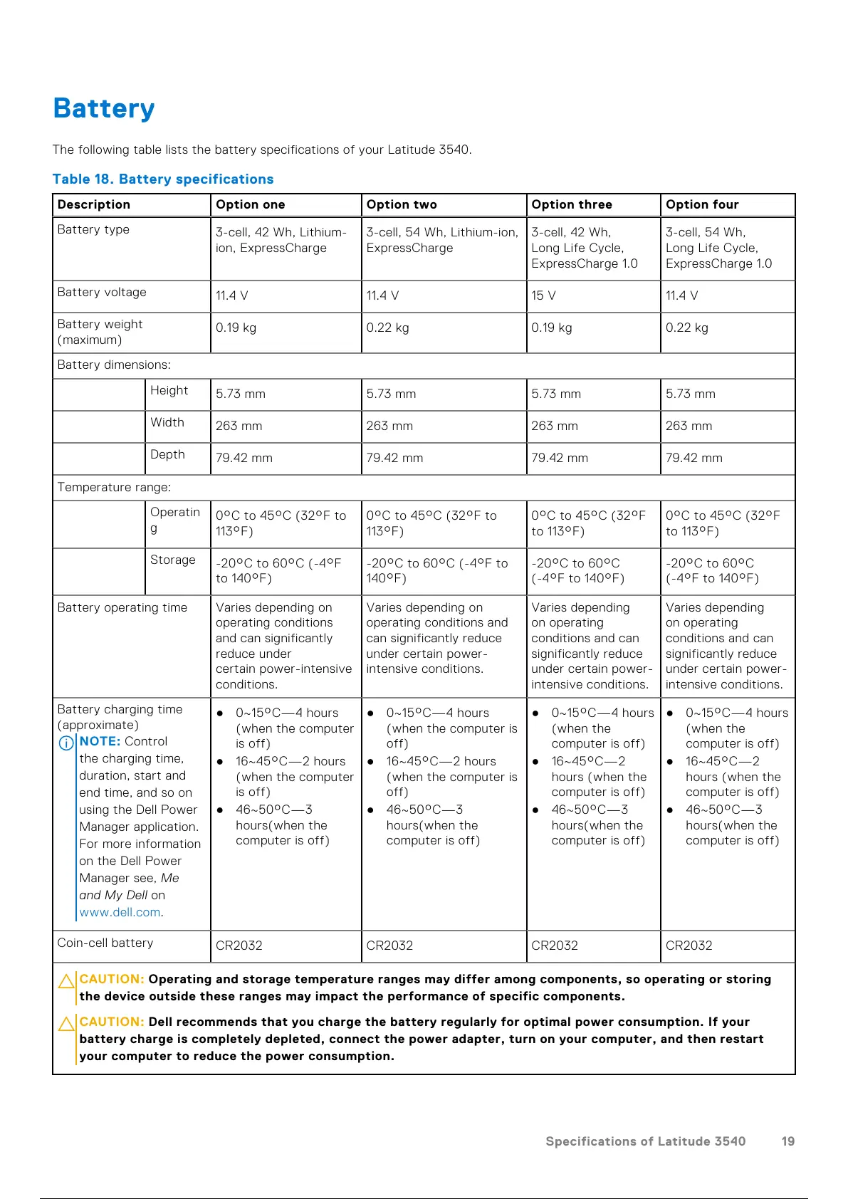 Table 18. Battery specifications