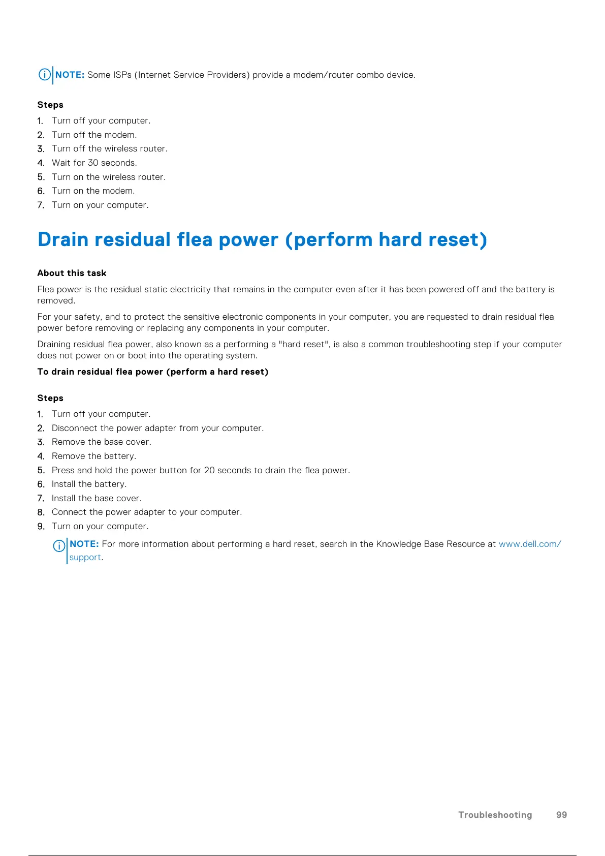 Draining residual flea power, also known as a performing a "hard reset", is also a common troubleshooting step if your computer