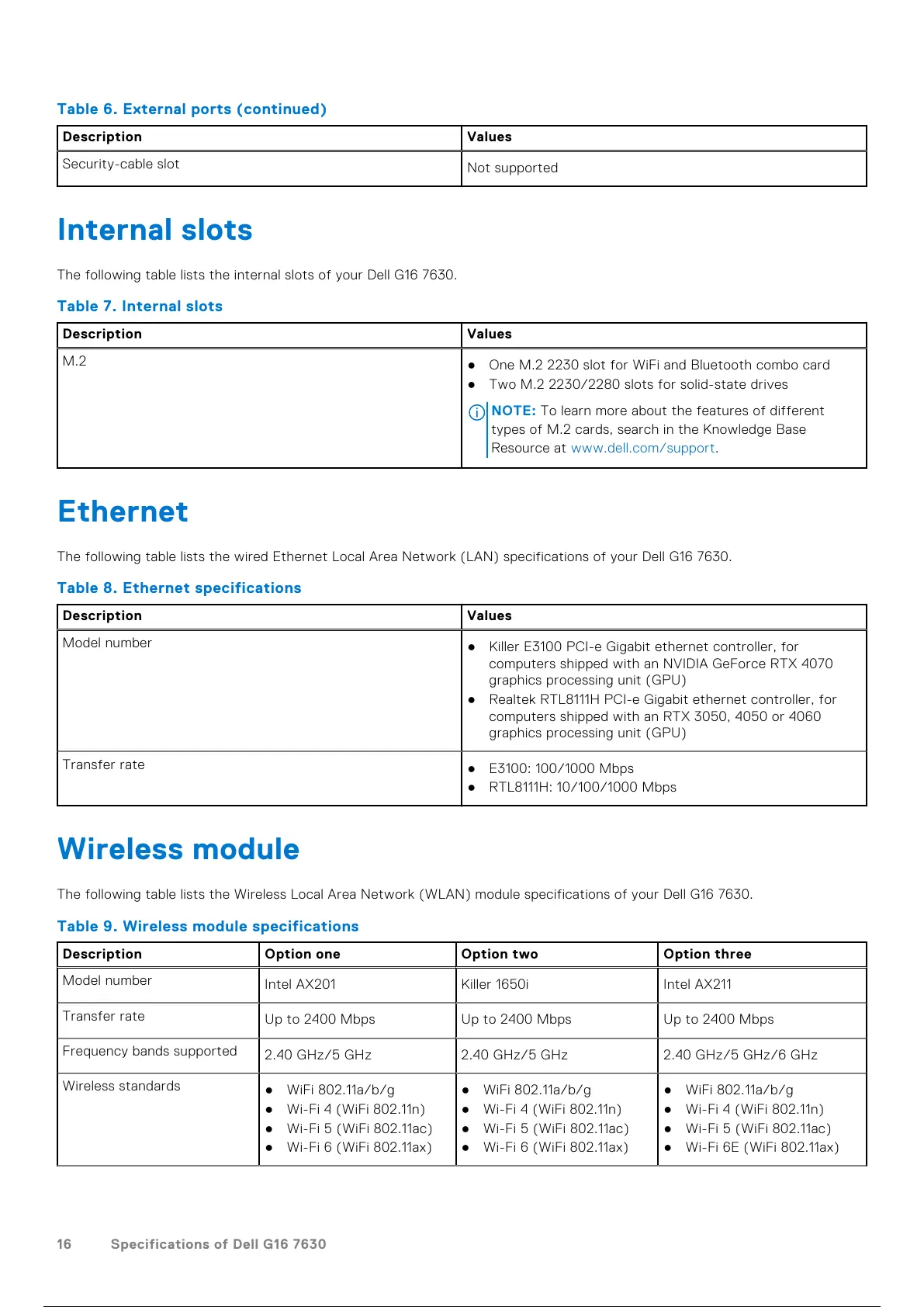 The following table lists the wired Ethernet Local Area Network (LAN) specifications of your Dell G16 7630.