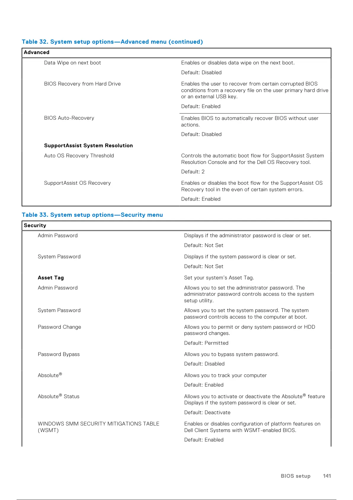 SupportAssist OS Recovery Enables or disables the boot flow for the SupportAssist OS