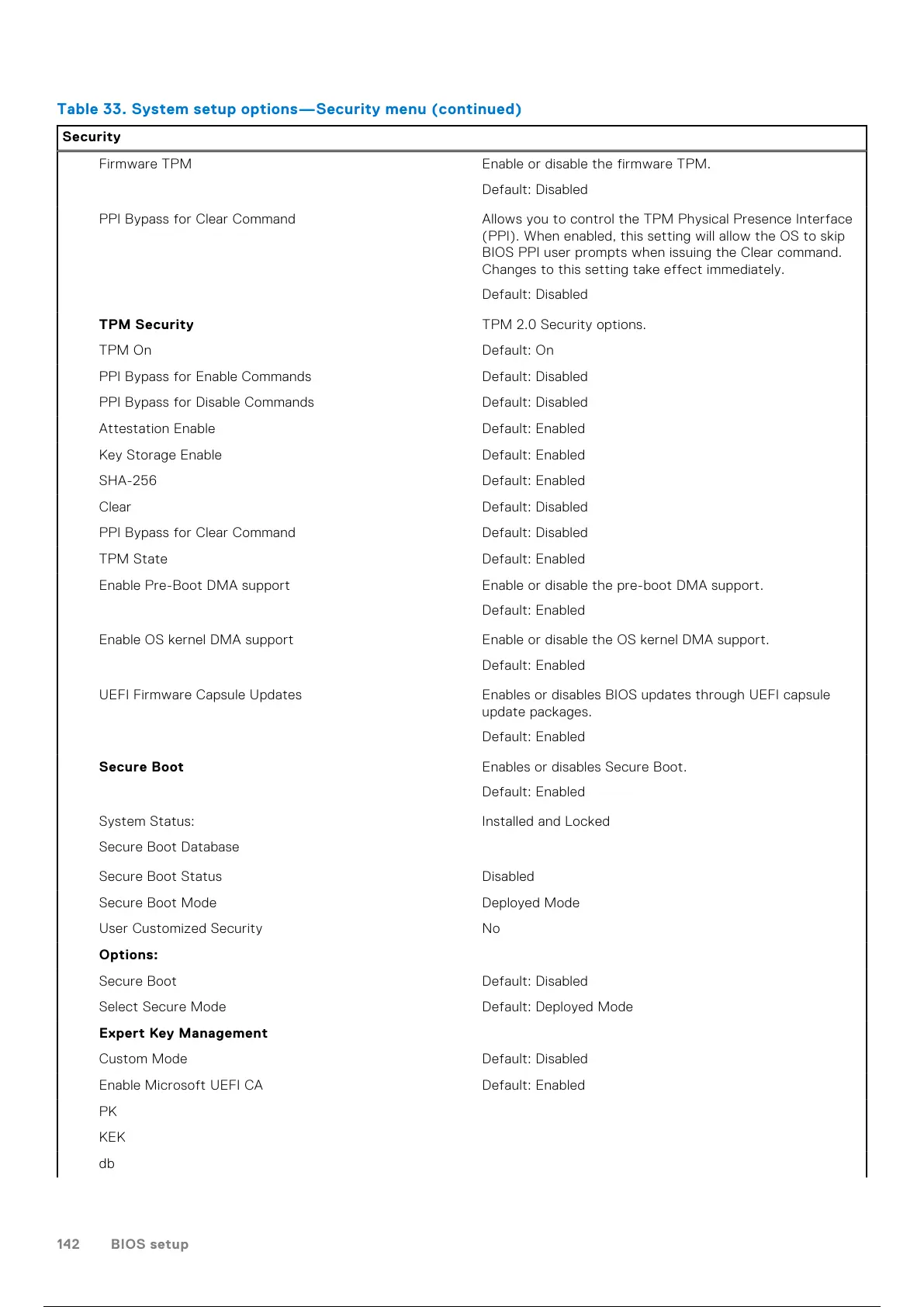 Table 33. System setup options—Security menu (continued)