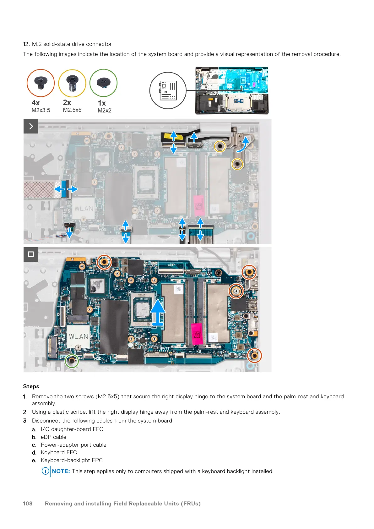 1. Remove the two screws (M2.5x5) that secure the right display hinge to the system board and the palm-rest and keyboard