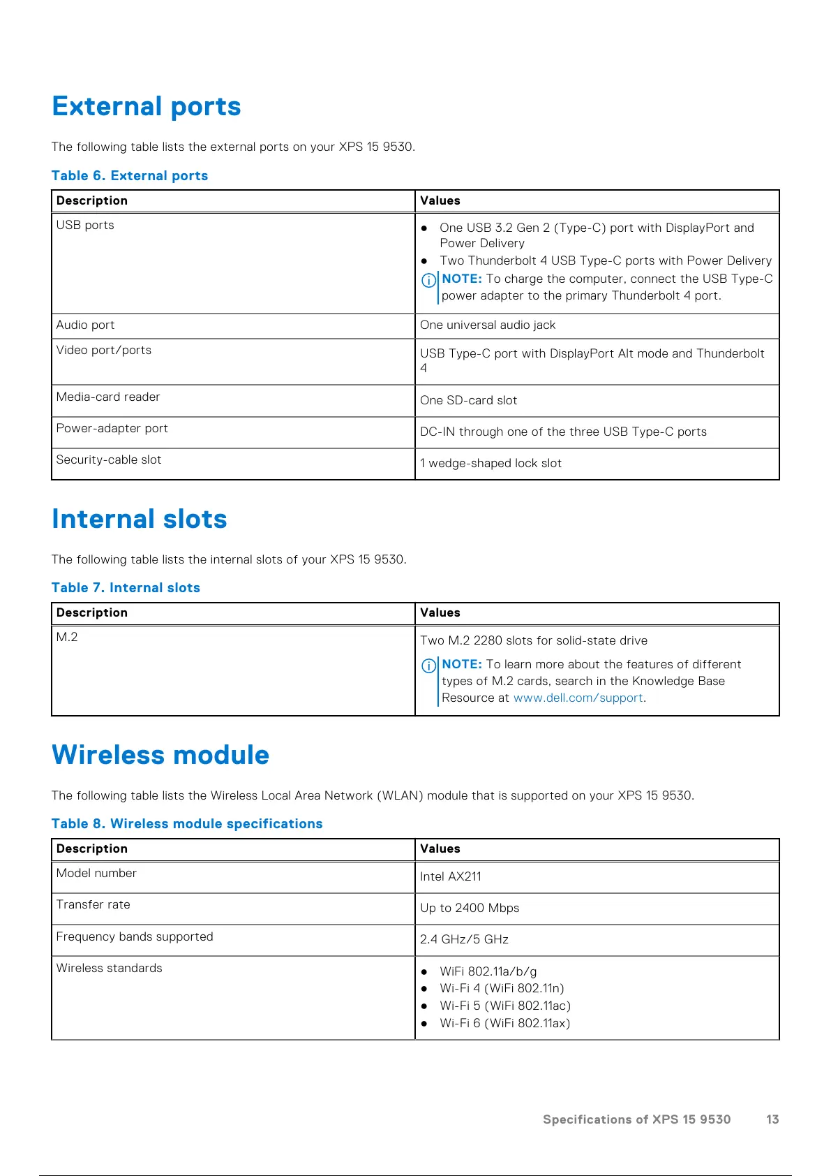 The following table lists the Wireless Local Area Network (WLAN) module that is supported on your XPS 15 9530.