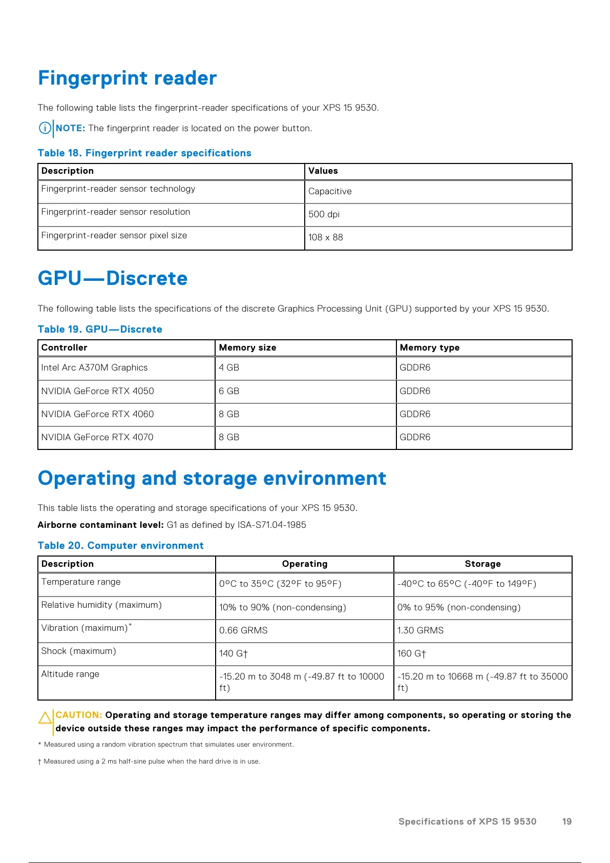 The following table lists the fingerprint-reader specifications of your XPS 15 9530.