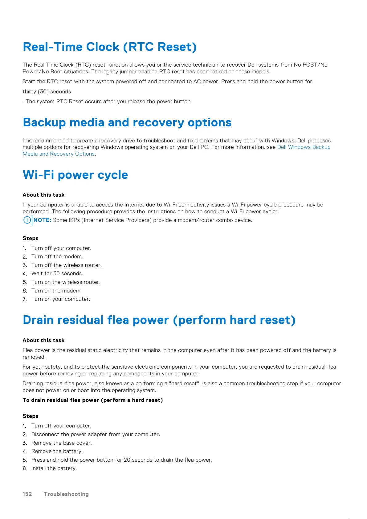 The Real Time Clock (RTC) reset function allows you or the service technician to recover Dell systems from No POST/No