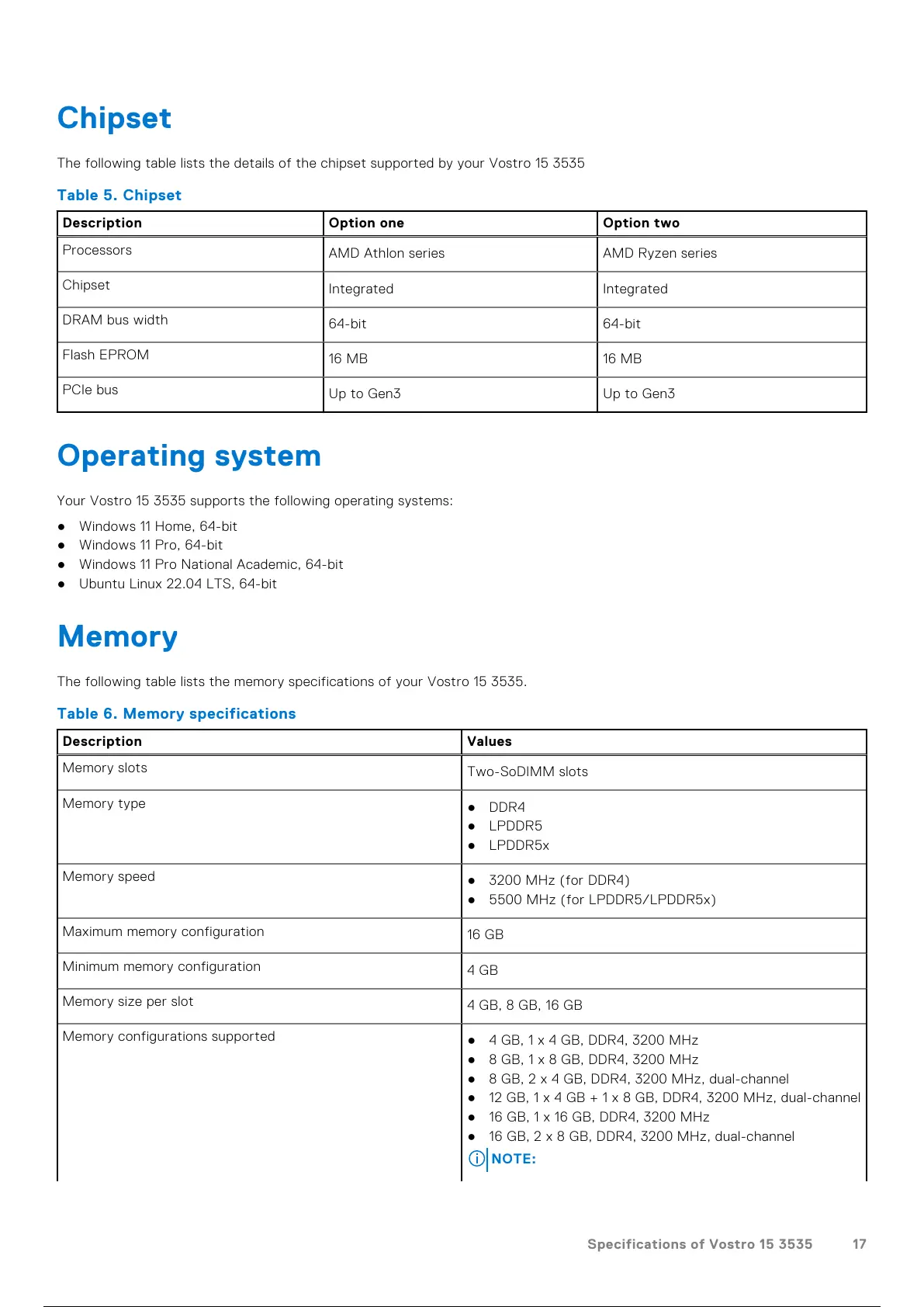 The following table lists the details of the chipset supported by your Vostro 15 3535
