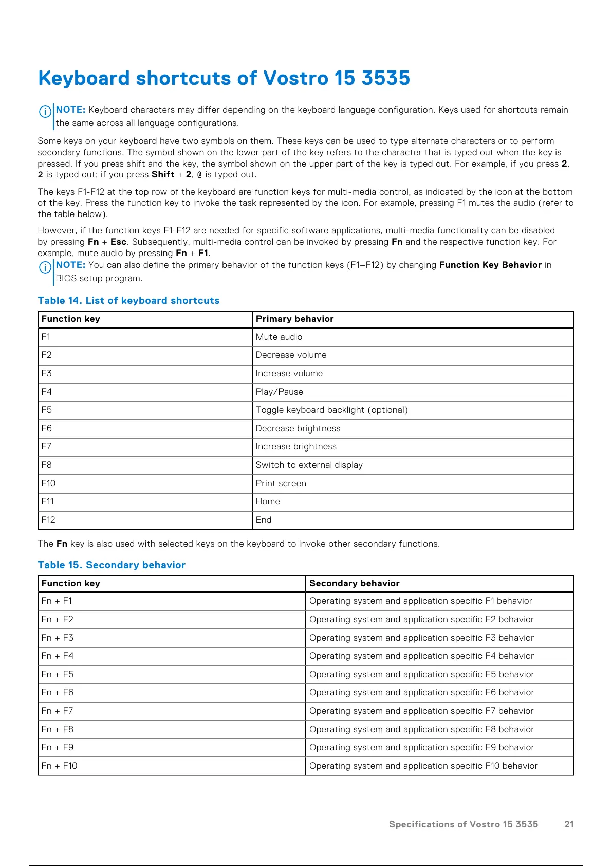 Keyboard shortcuts of Vostro 15 3535