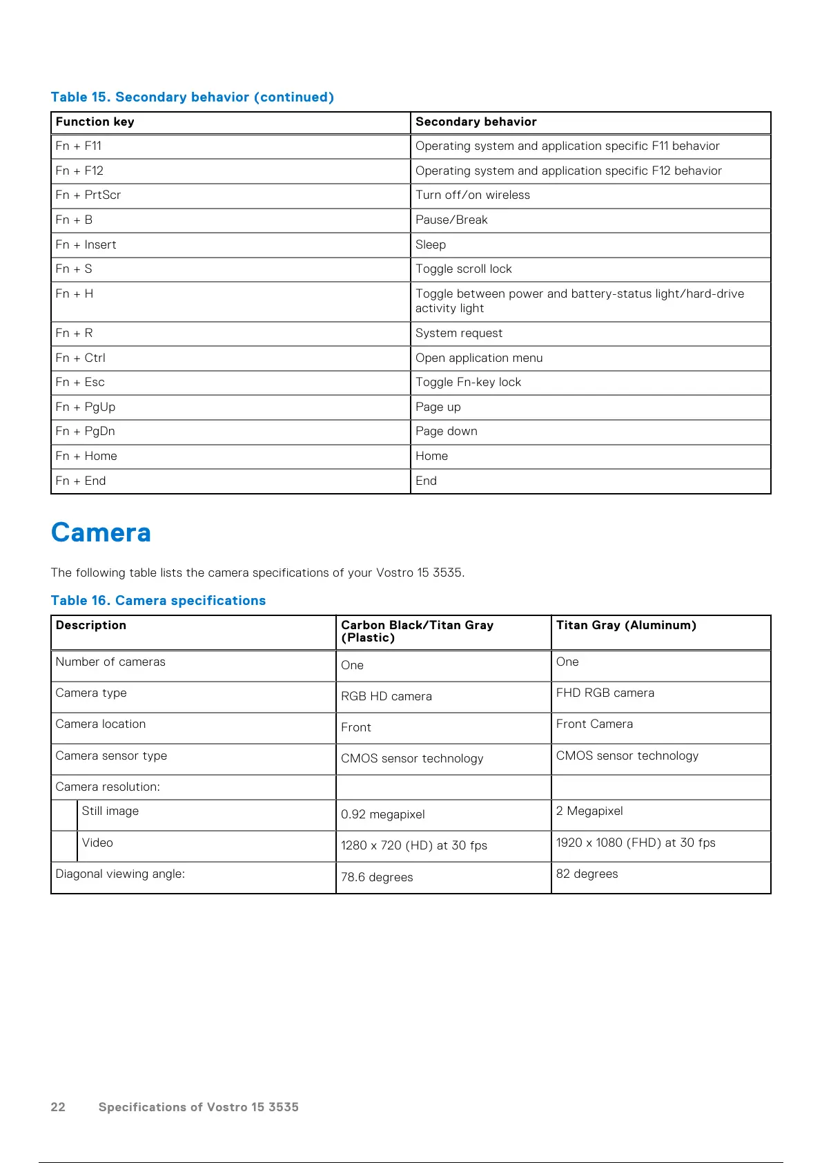 The following table lists the camera specifications of your Vostro 15 3535.