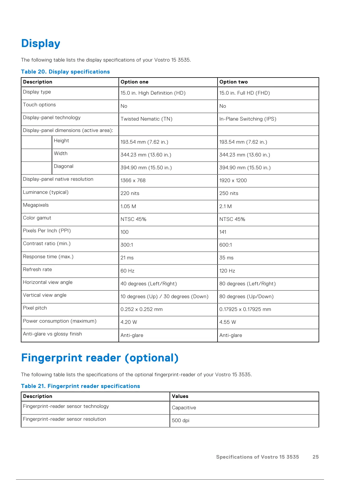 The following table lists the display specifications of your Vostro 15 3535.