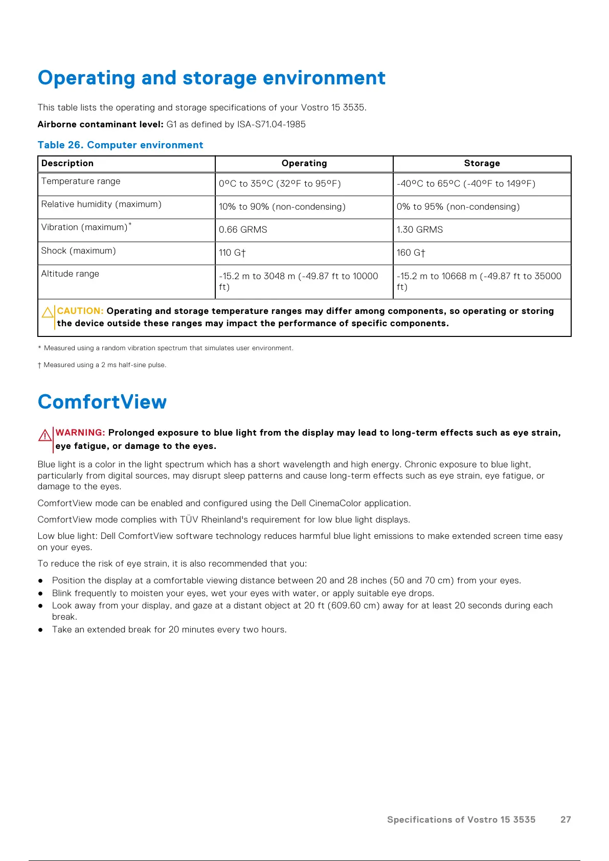 Dell NOT22396 - Operating and Storage Environment; Comfortview
