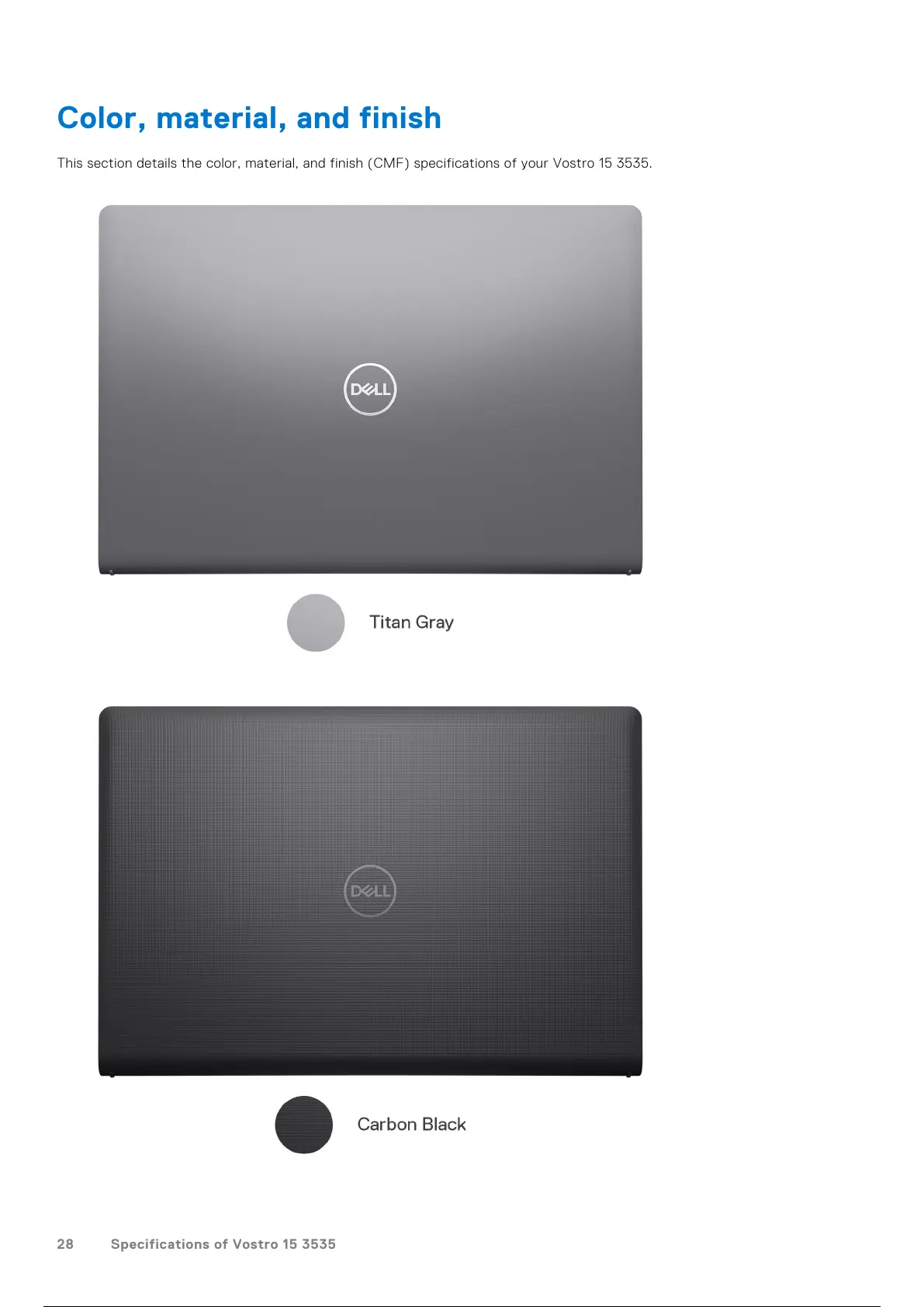 This section details the color, material, and finish (CMF) specifications of your Vostro 15 3535.