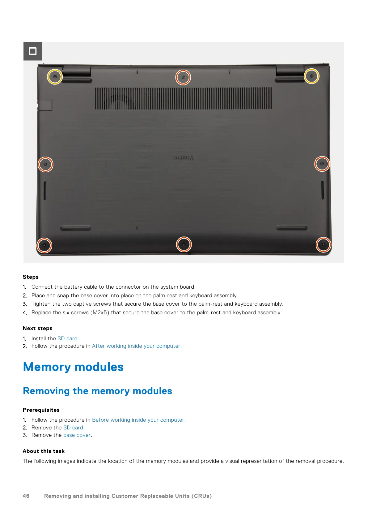 4. Replace the six screws (M2x5) that secure the base cover to the palm-rest and keyboard assembly.