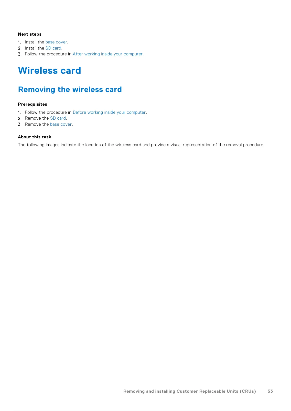 The following images indicate the location of the wireless card and provide a visual representation of the removal procedure.