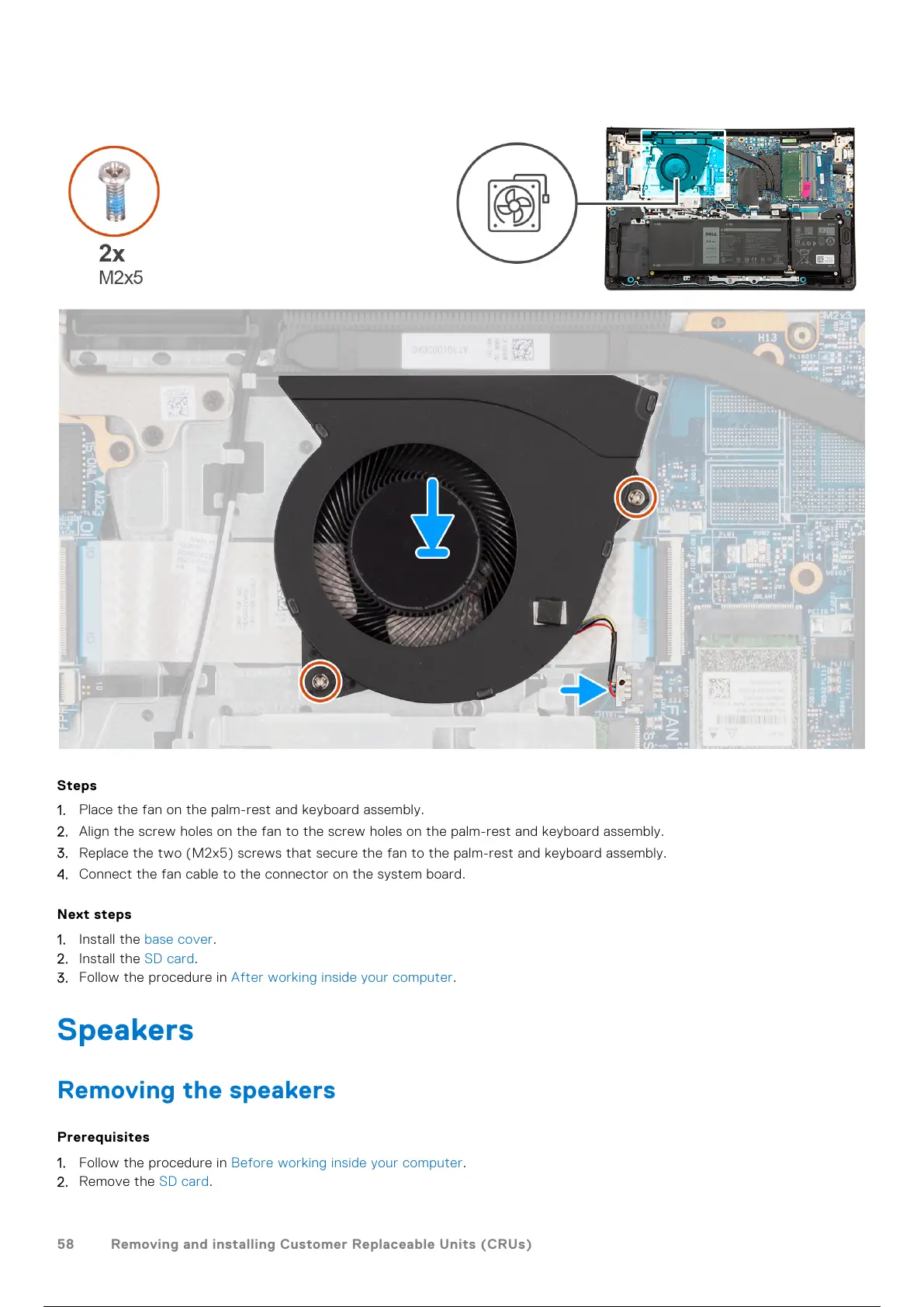 3. Replace the two (M2x5) screws that secure the fan to the palm-rest and keyboard assembly.