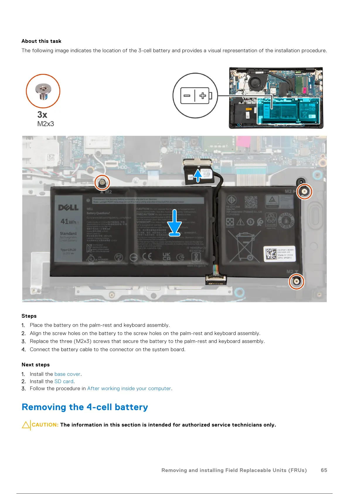 The following image indicates the location of the 3-cell battery and provides a visual representation of the installation procedure.