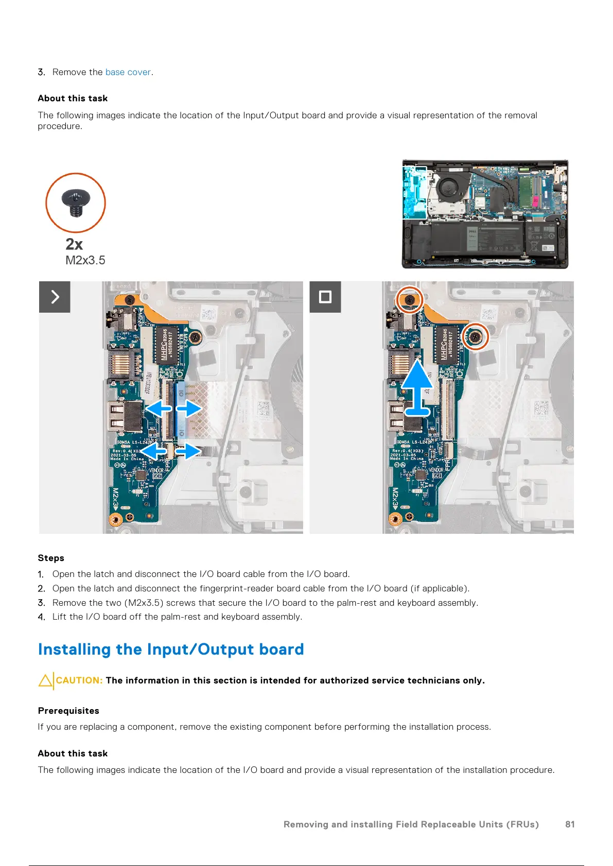 3. Remove the two (M2x3.5) screws that secure the I/O board to the palm-rest and keyboard assembly.