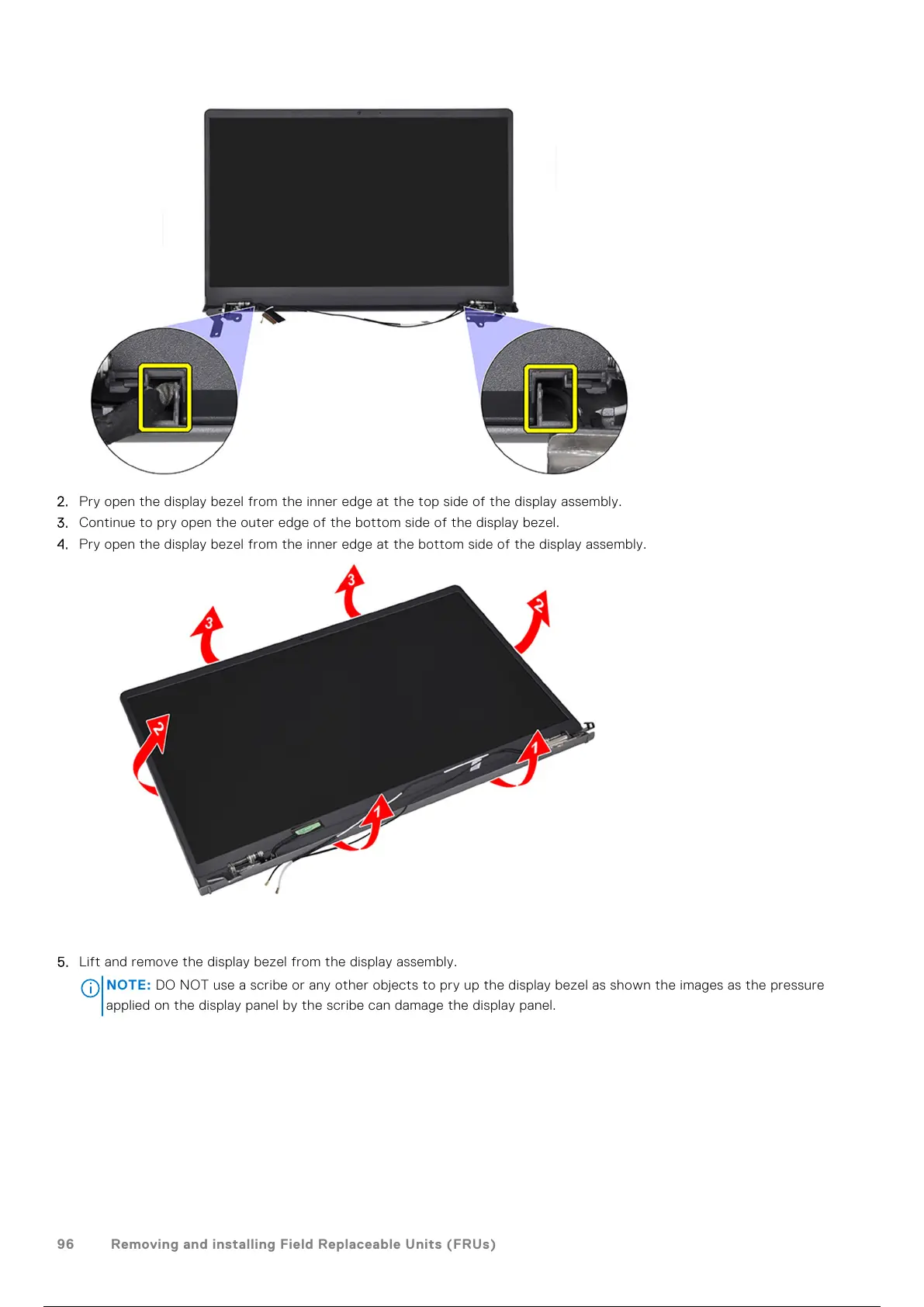 DO NOT use a scribe or any other objects to pry up the display bezel as shown the images as the pressure