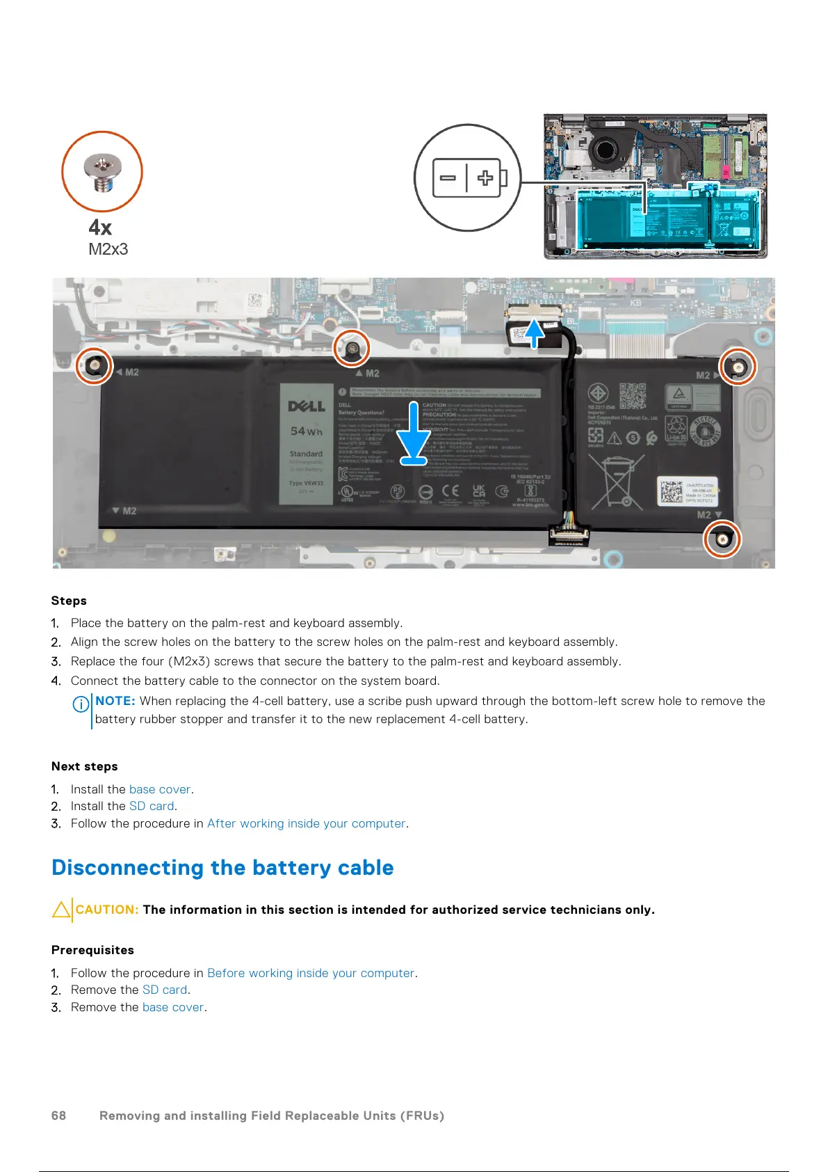 3. Replace the four (M2x3) screws that secure the battery to the palm-rest and keyboard assembly.