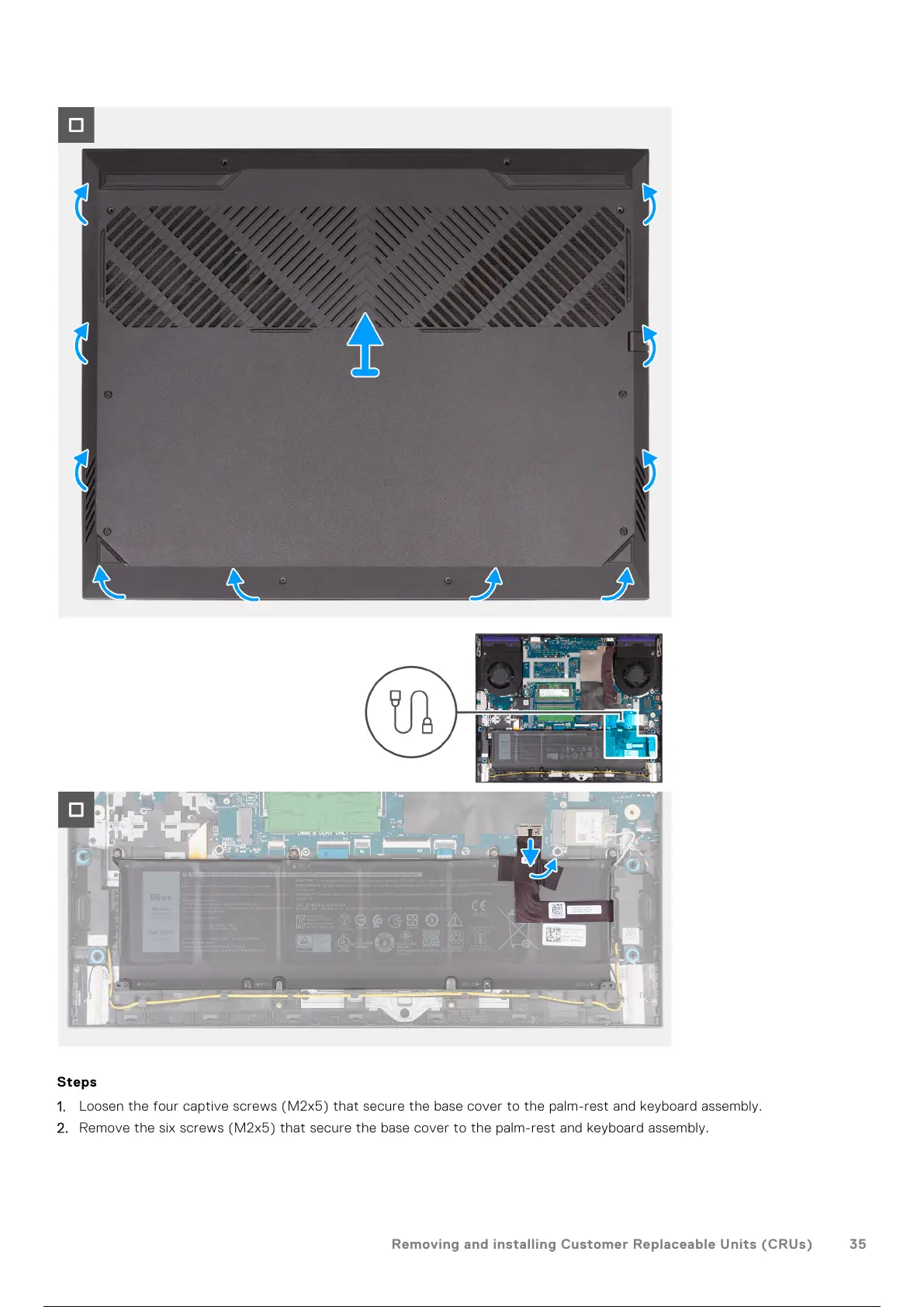 1. Loosen the four captive screws (M2x5) that secure the base cover to the palm-rest and keyboard assembly.