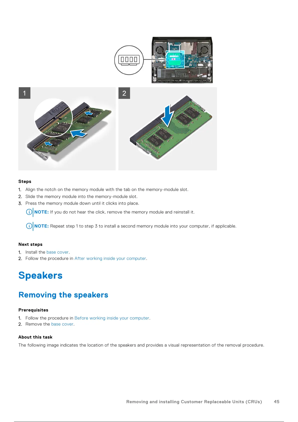 NOTE: If you do not hear the click, remove the memory module and reinstall it.