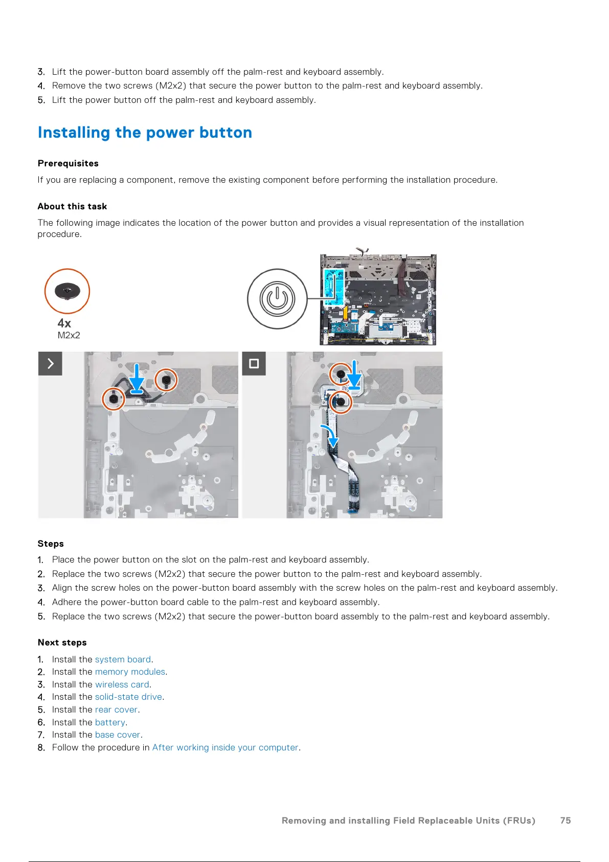 2. Replace the two screws (M2x2) that secure the power button to the palm-rest and keyboard assembly.