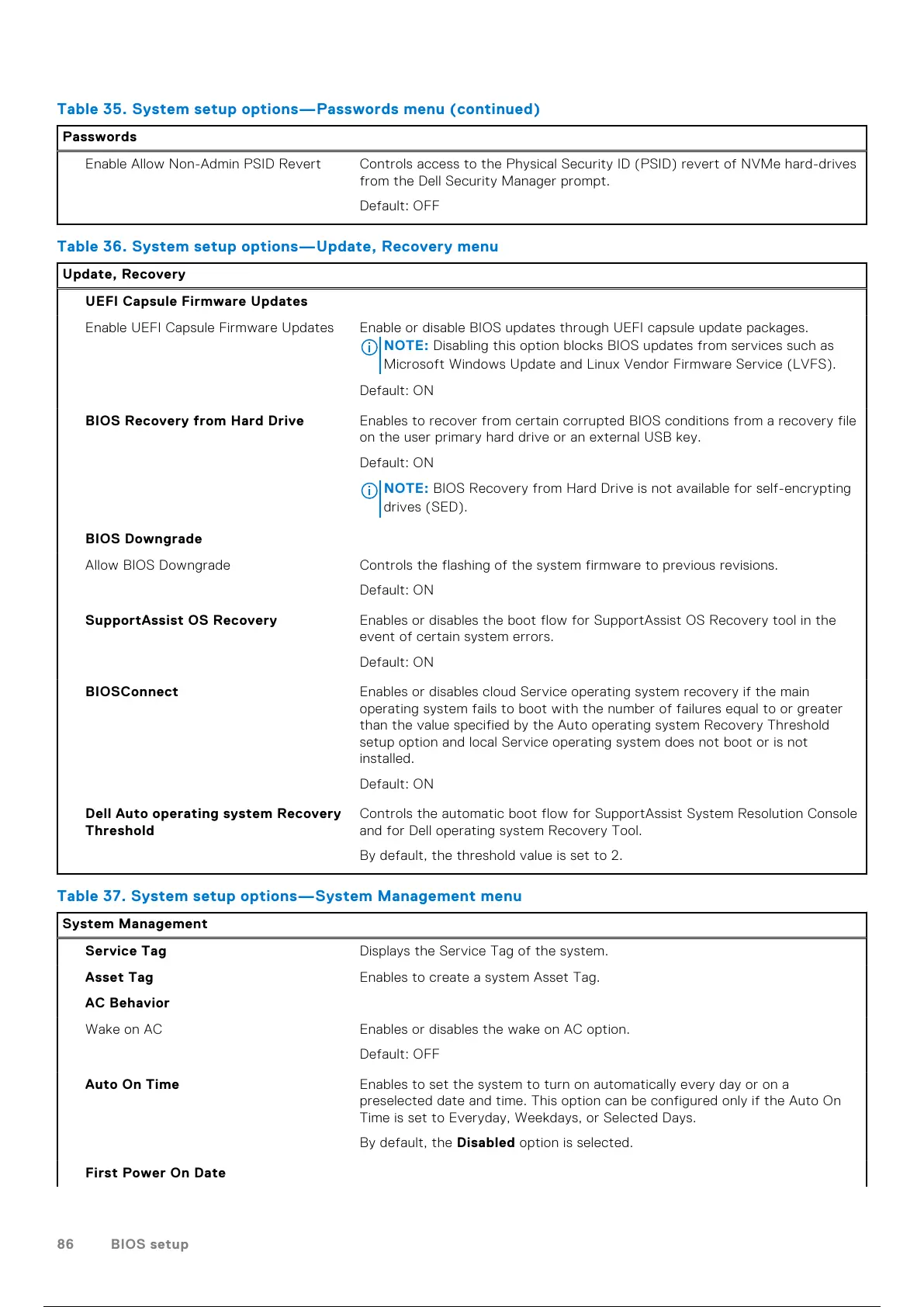Table 36. System setup options—Update, Recovery menu