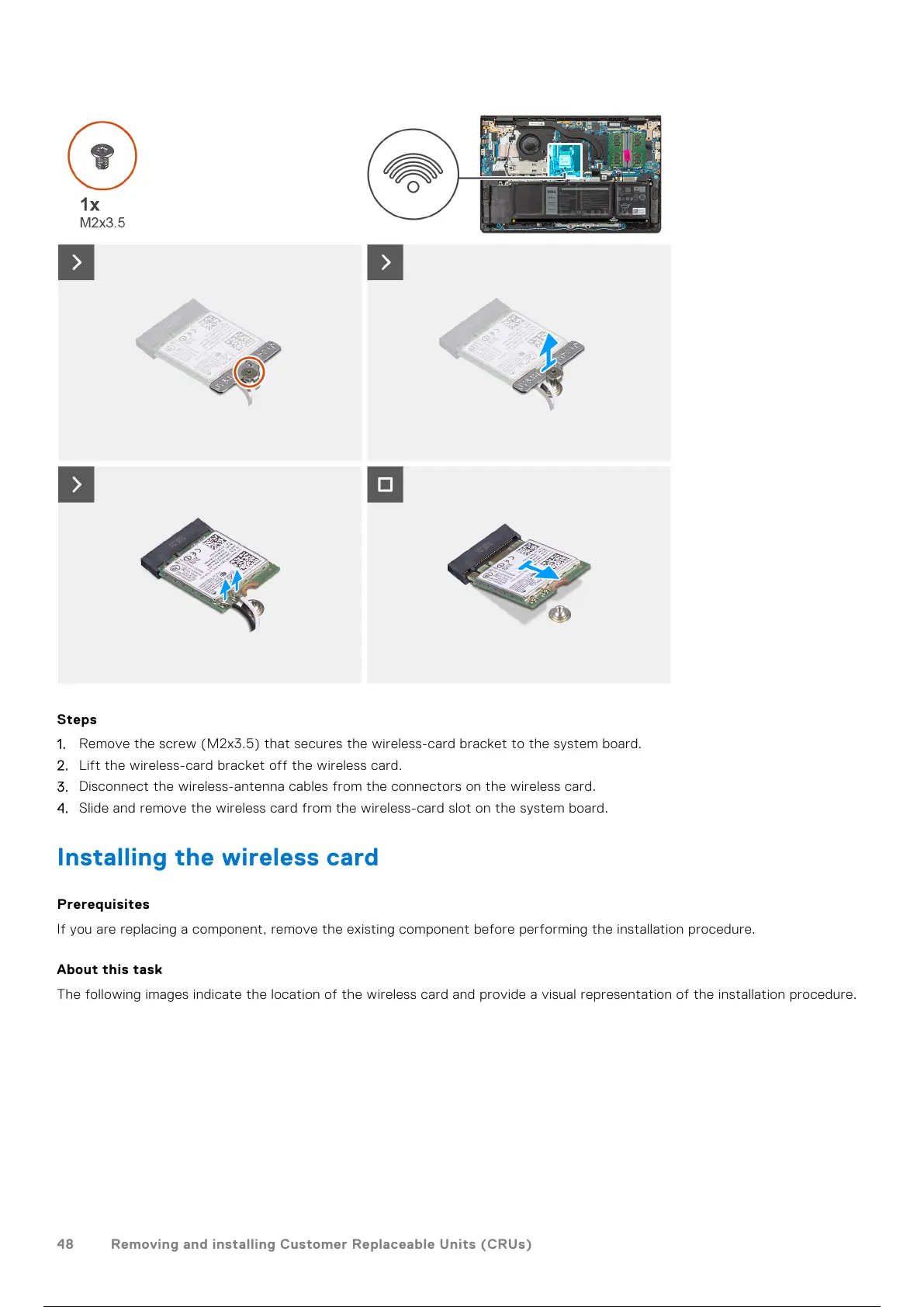 The following images indicate the location of the wireless card and provide a visual representation of the installation procedure.