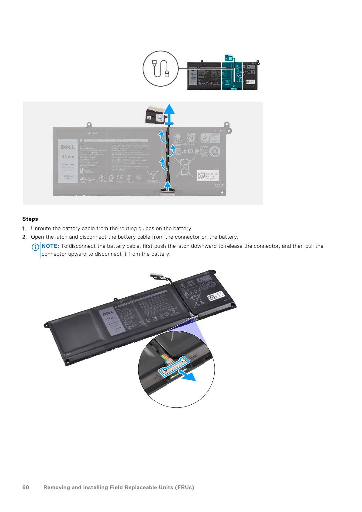 To disconnect the battery cable, first push the latch downward to release the connector, and then pull the