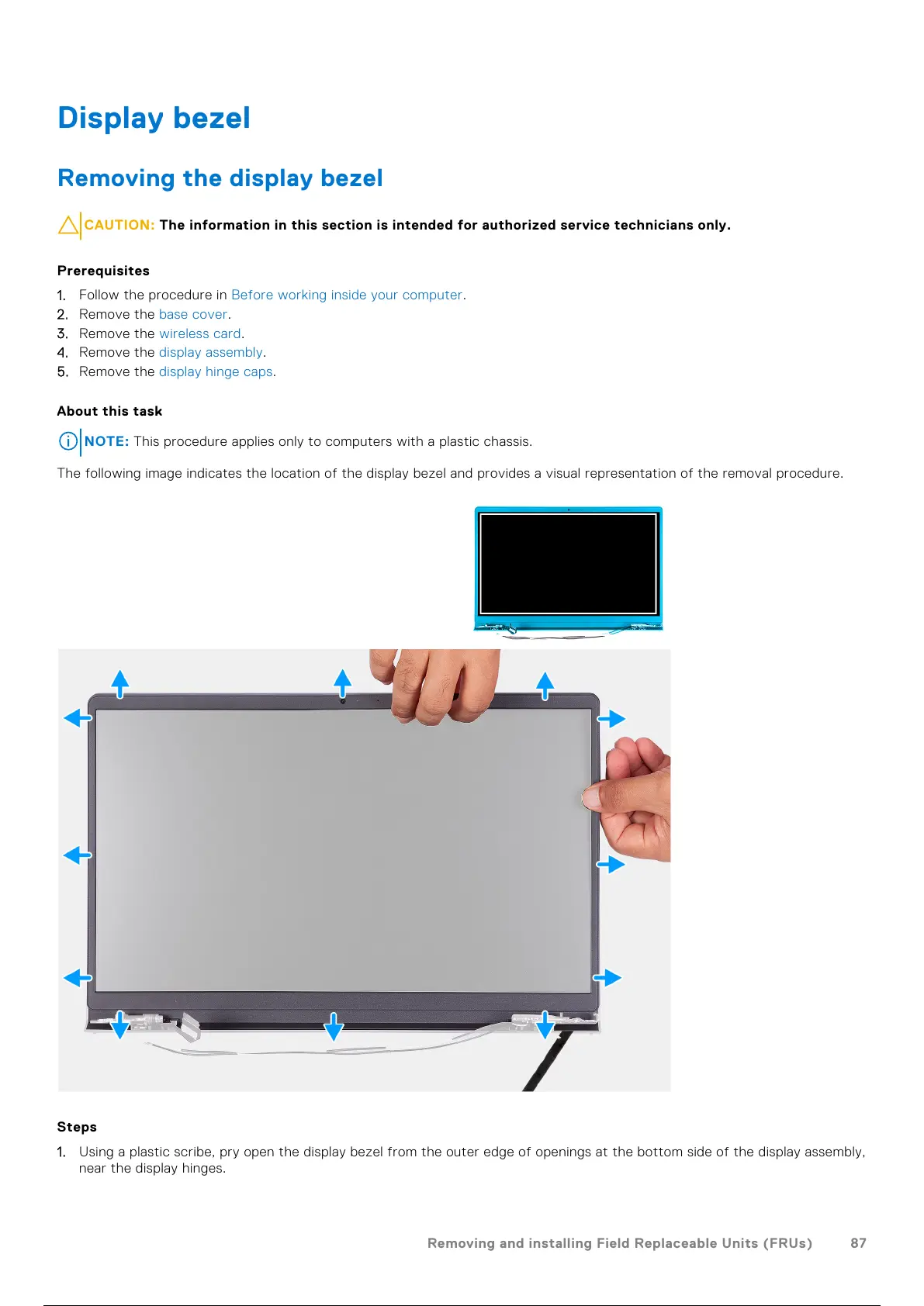 1. Using a plastic scribe, pry open the display bezel from the outer edge of openings at the bottom side of the display assembly,