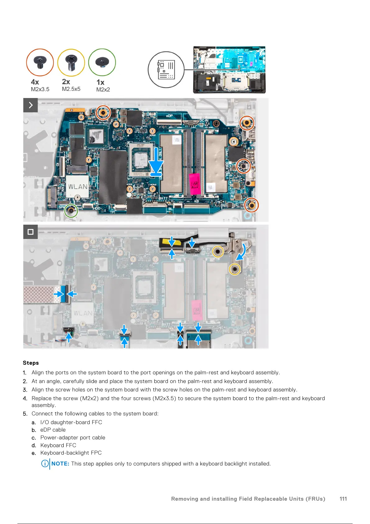 4. Replace the screw (M2x2) and the four screws (M2x3.5) to secure the system board to the palm-rest and keyboard