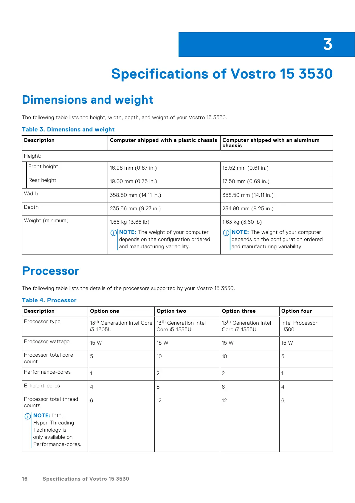 The following table lists the details of the processors supported by your Vostro 15 3530.