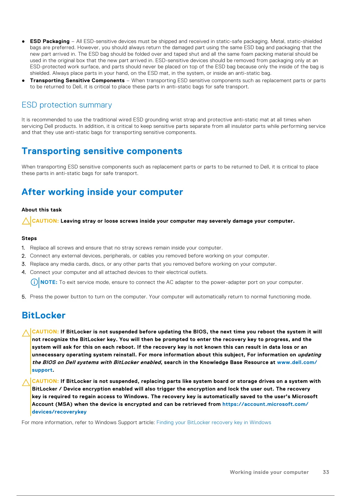 CAUTION: If BitLocker is not suspended, replacing parts like system board or storage drives on a system with