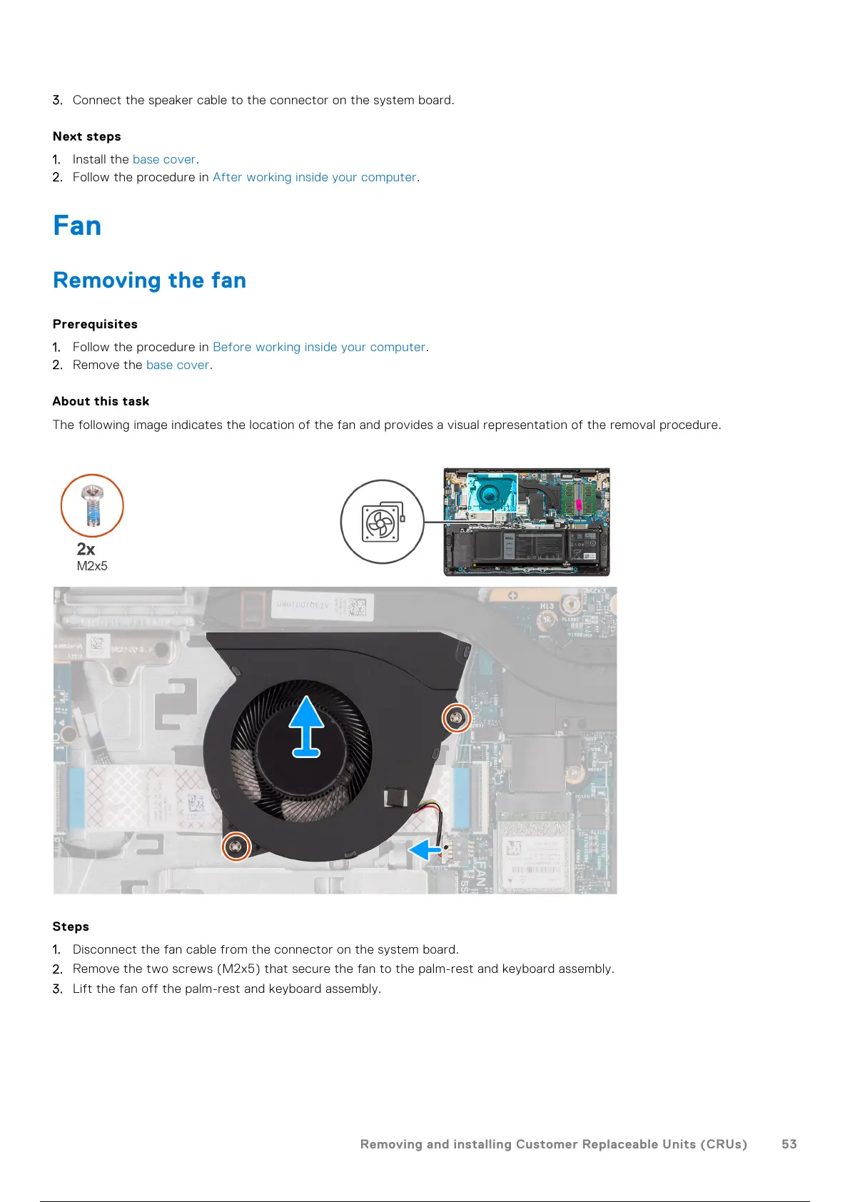 2. Remove the two screws (M2x5) that secure the fan to the palm-rest and keyboard assembly.