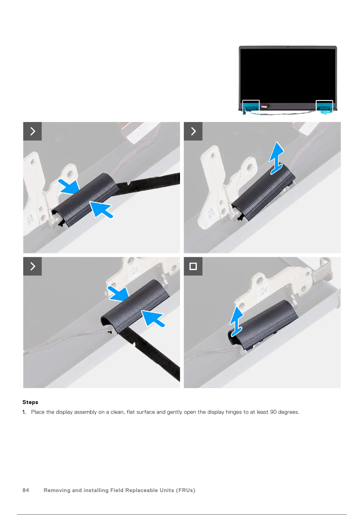 1. Place the display assembly on a clean, flat surface and gently open the display hinges to at least 90 degrees.
