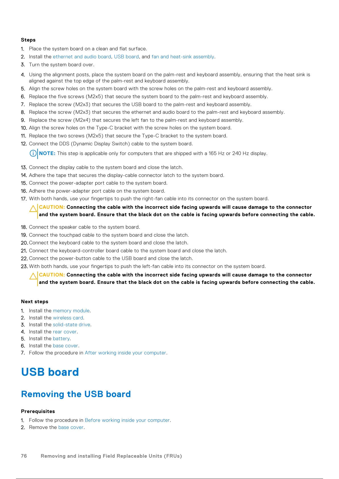 and the system board. Ensure that the black dot on the cable is facing upwards before connecting the cable.