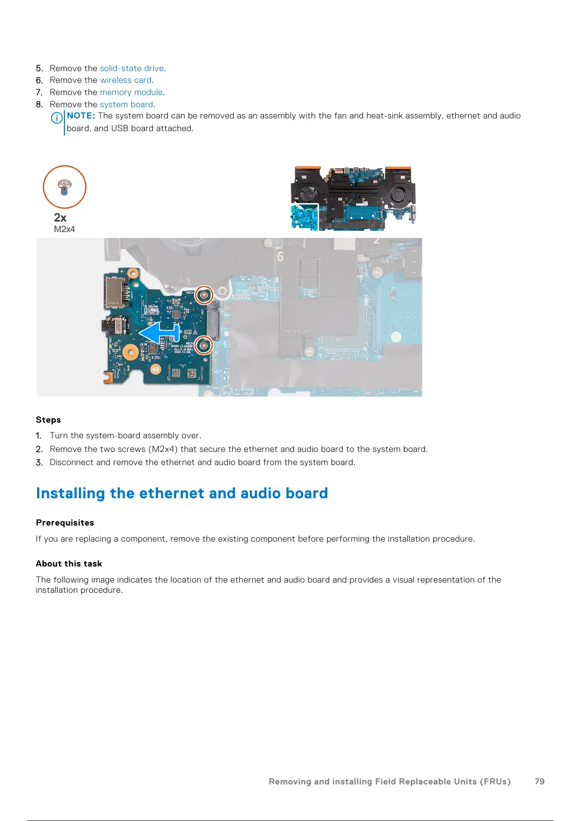 NOTE: The system board can be removed as an assembly with the fan and heat-sink assembly, ethernet and audio