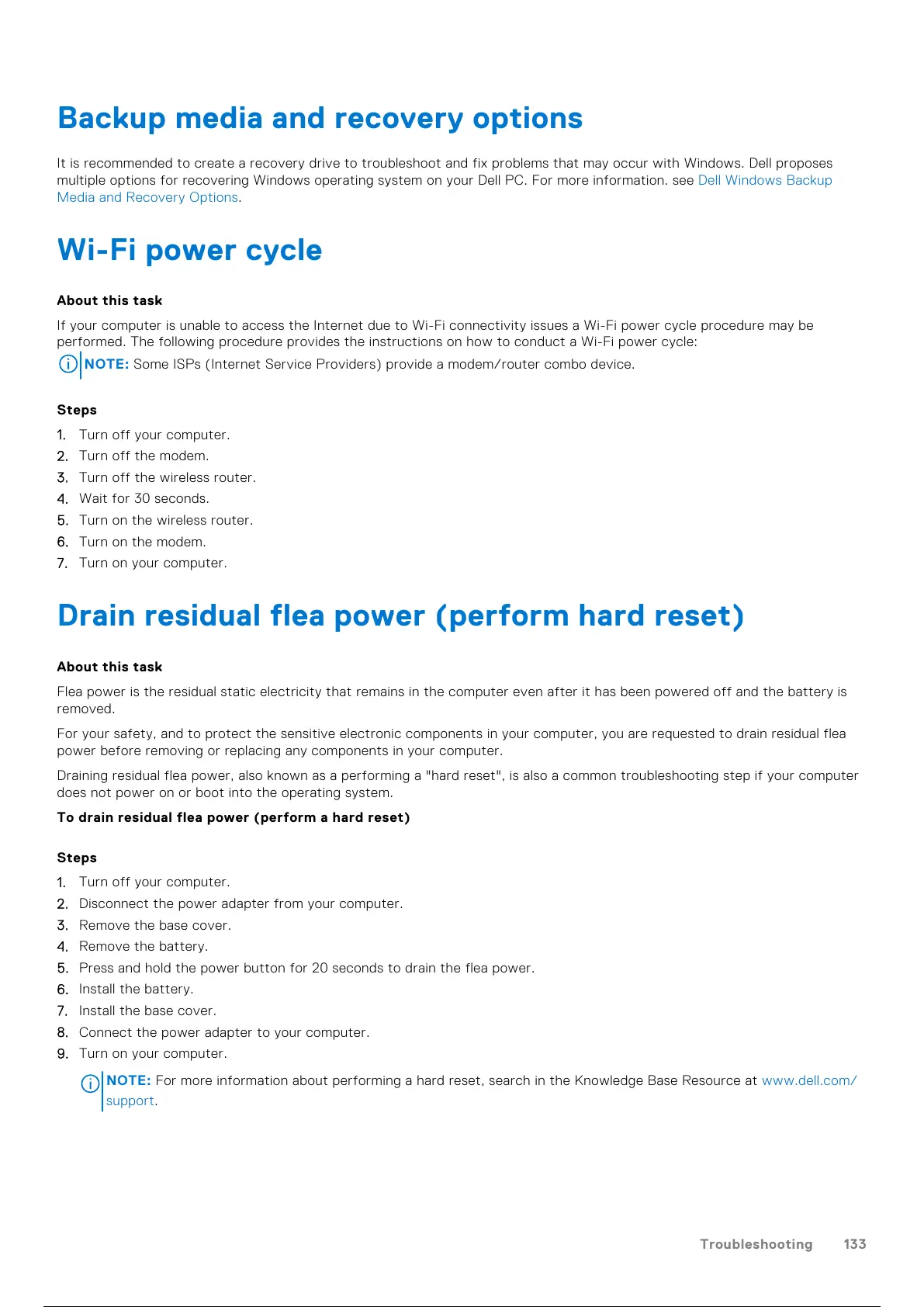 Draining residual flea power, also known as a performing a "hard reset", is also a common troubleshooting step if your computer