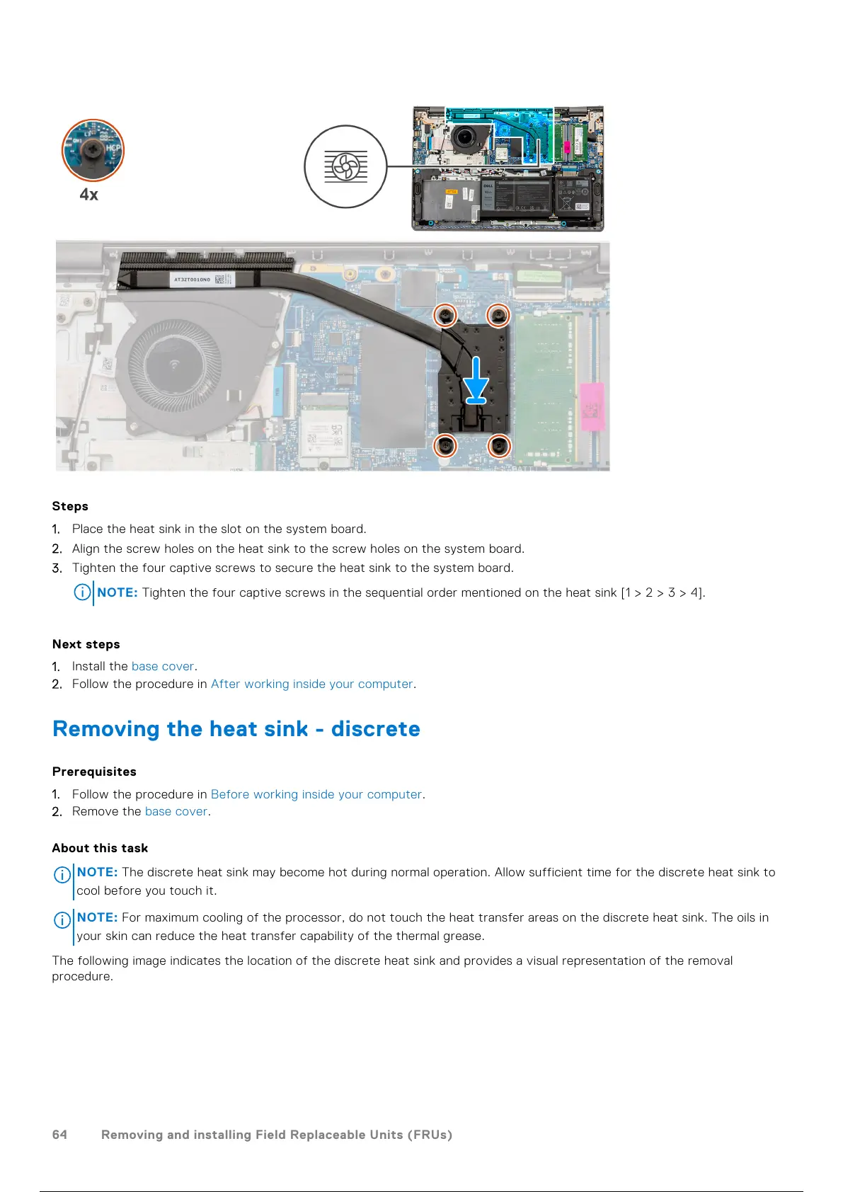 NOTE: For maximum cooling of the processor, do not touch the heat transfer areas on the discrete heat sink. The oils in
