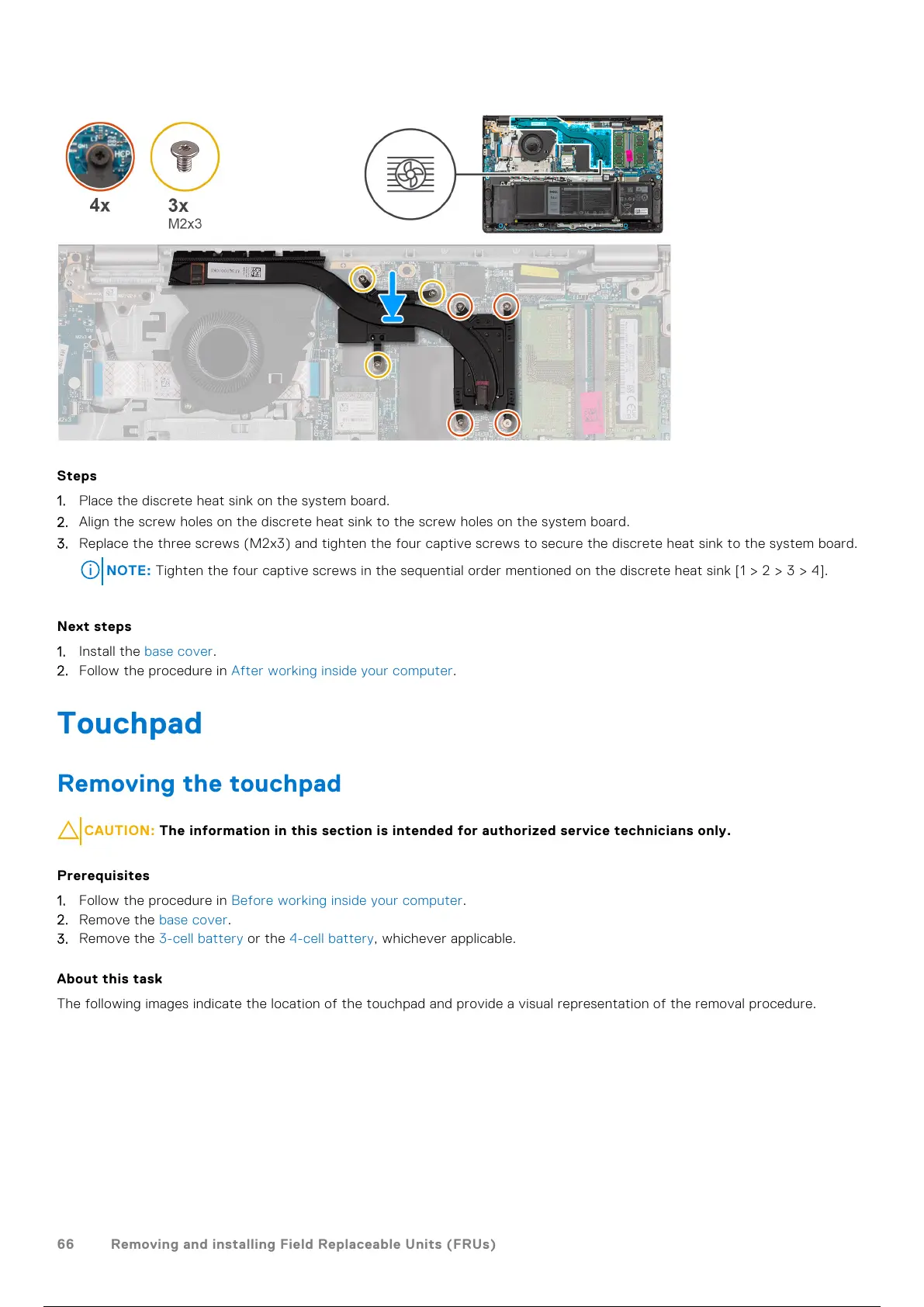 3. Replace the three screws (M2x3) and tighten the four captive screws to secure the discrete heat sink to the system board.