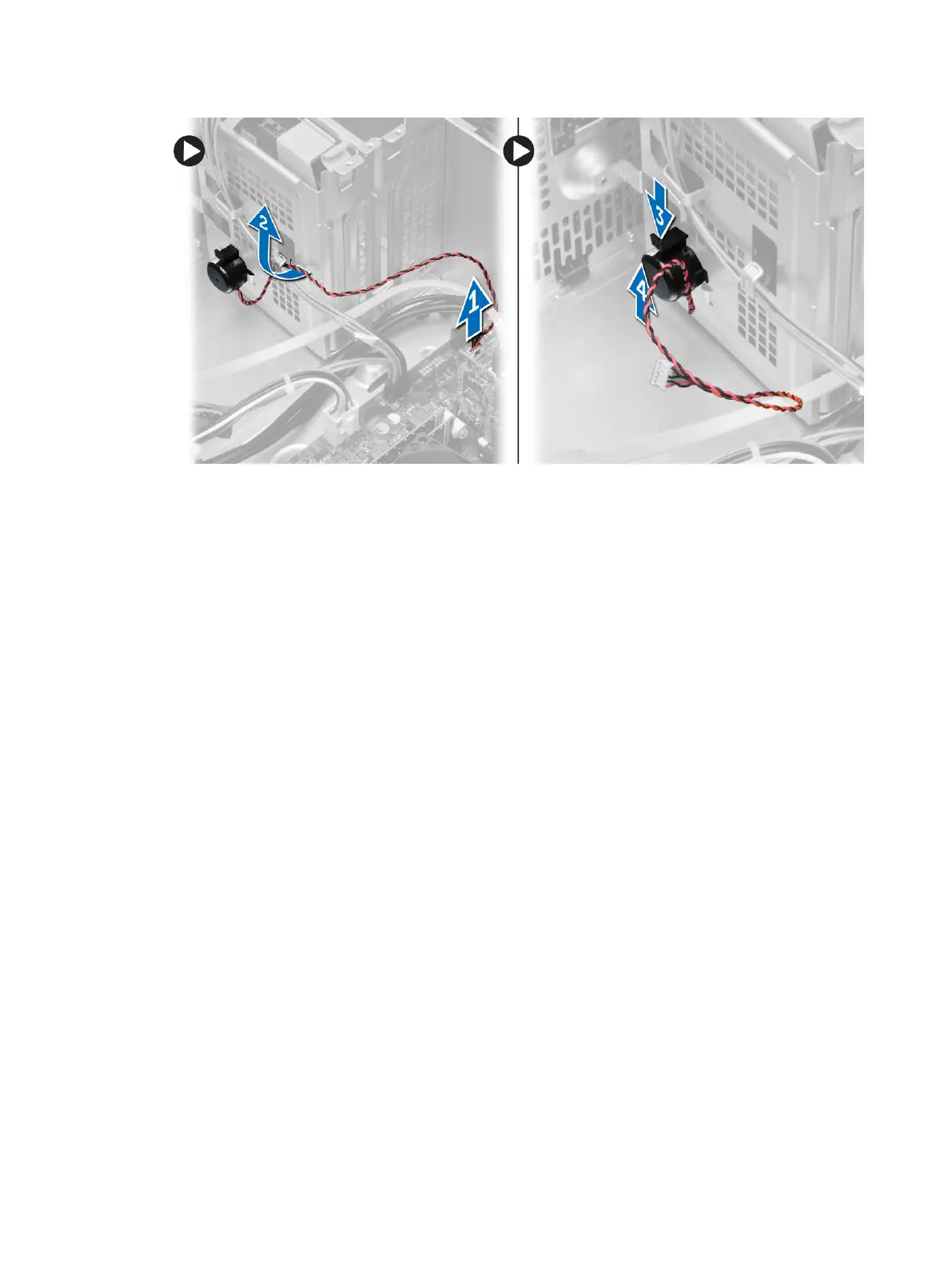 2. Thread the speaker cable into the chassis clip and connect the speaker cable to the system board.
