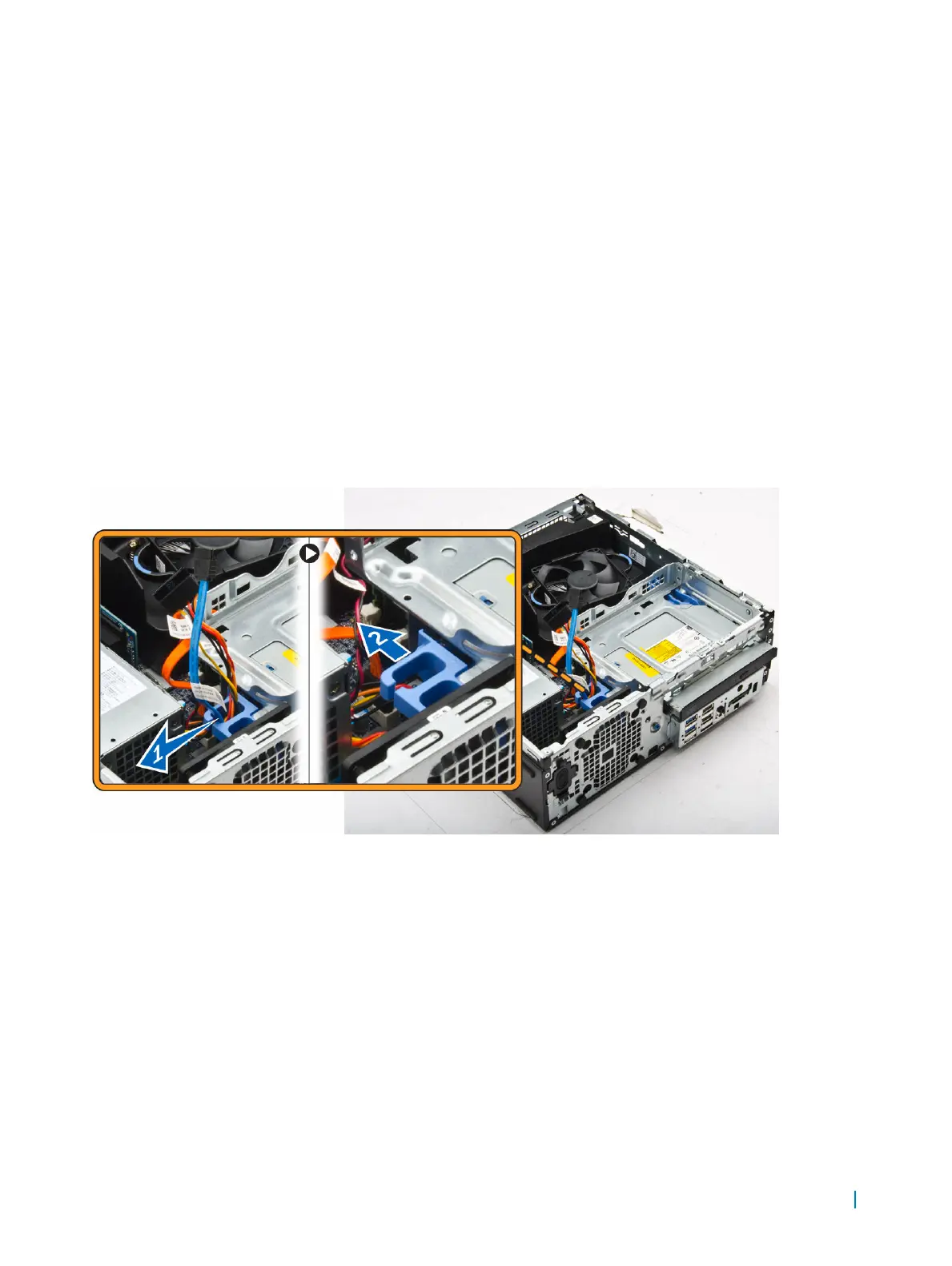 a Holding the blue latch [1], lift the optical drive cage and disconnect the cables from the optical drive. [2]