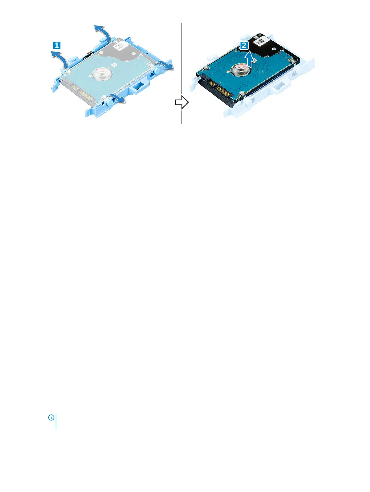 1 Flex the side of the hard drive bracket, to align and insert the pins on the bracket into the hard drive.